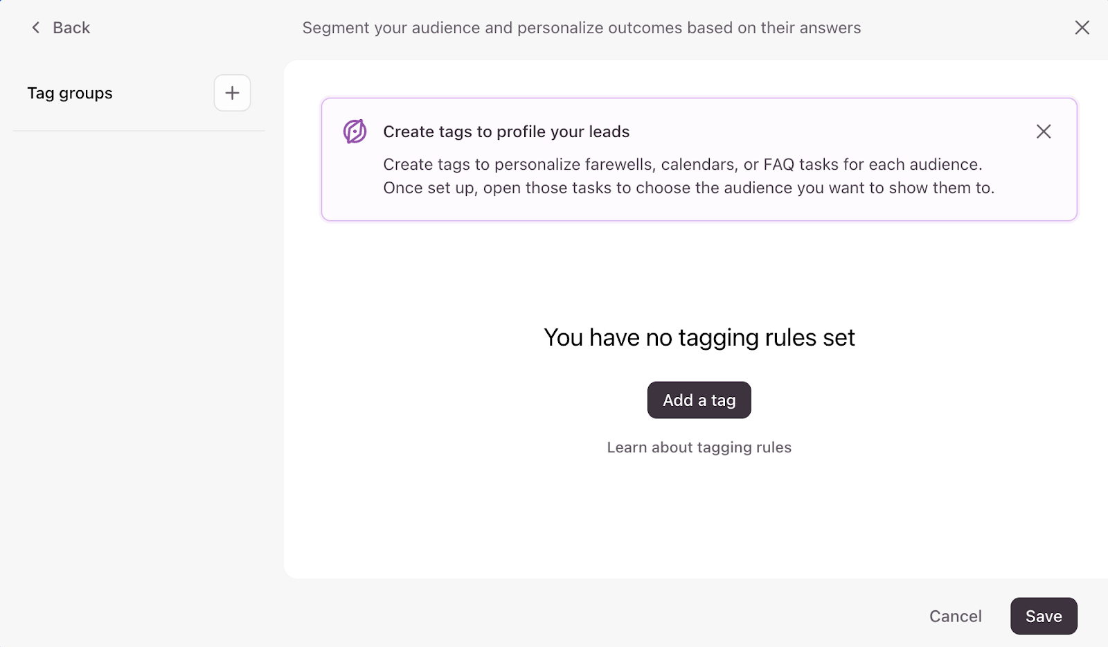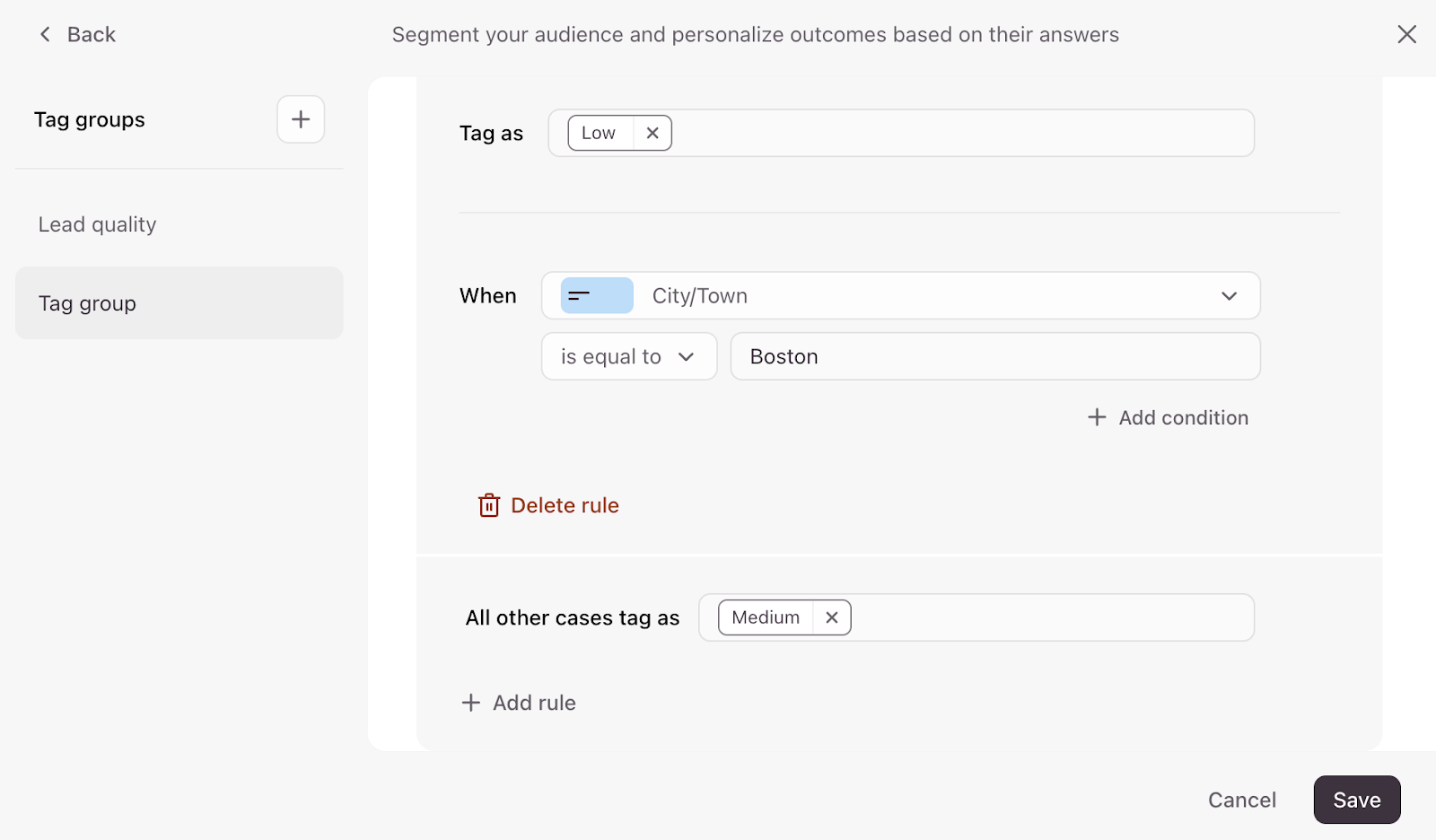 You can also click + Add rule and enter a tag to segment your audience further, for example, by adding a Medium quality lead tag. Click Save when you’re done with setting up your tagging rules.