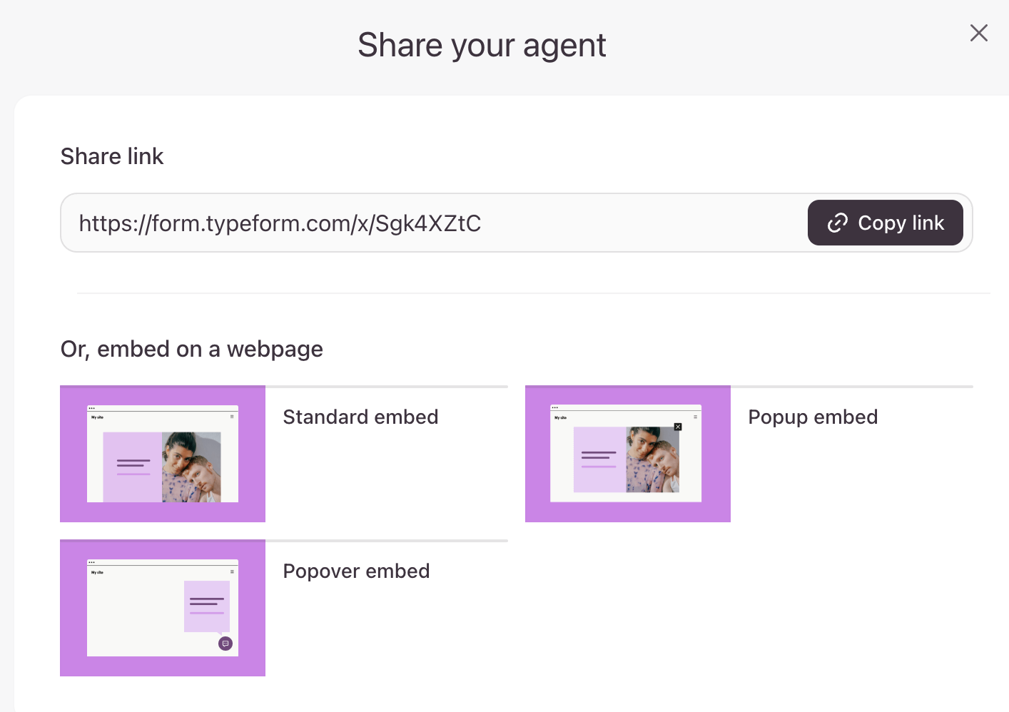 You can now share your Inbound Sales Agent’s link by clicking Copy link next to the URL, or you can also choose to embed it on a webpage as a standard, popup, or popover embed. Learn more about embedding with Typeform here.