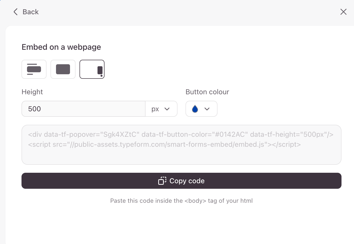 Click the name of an embed type to customize your embed settings, and click Copy code when you’re happy with your embed.
