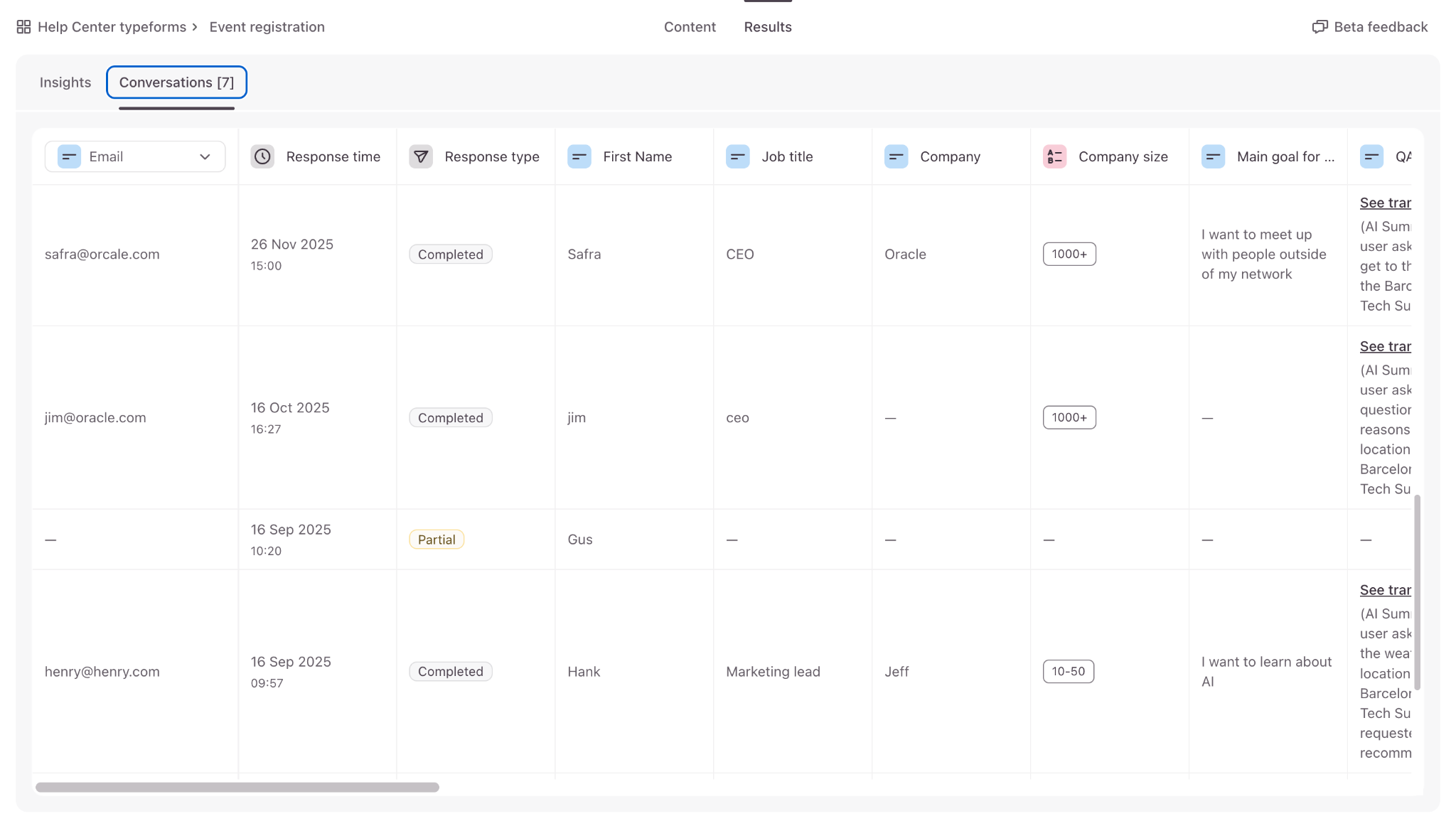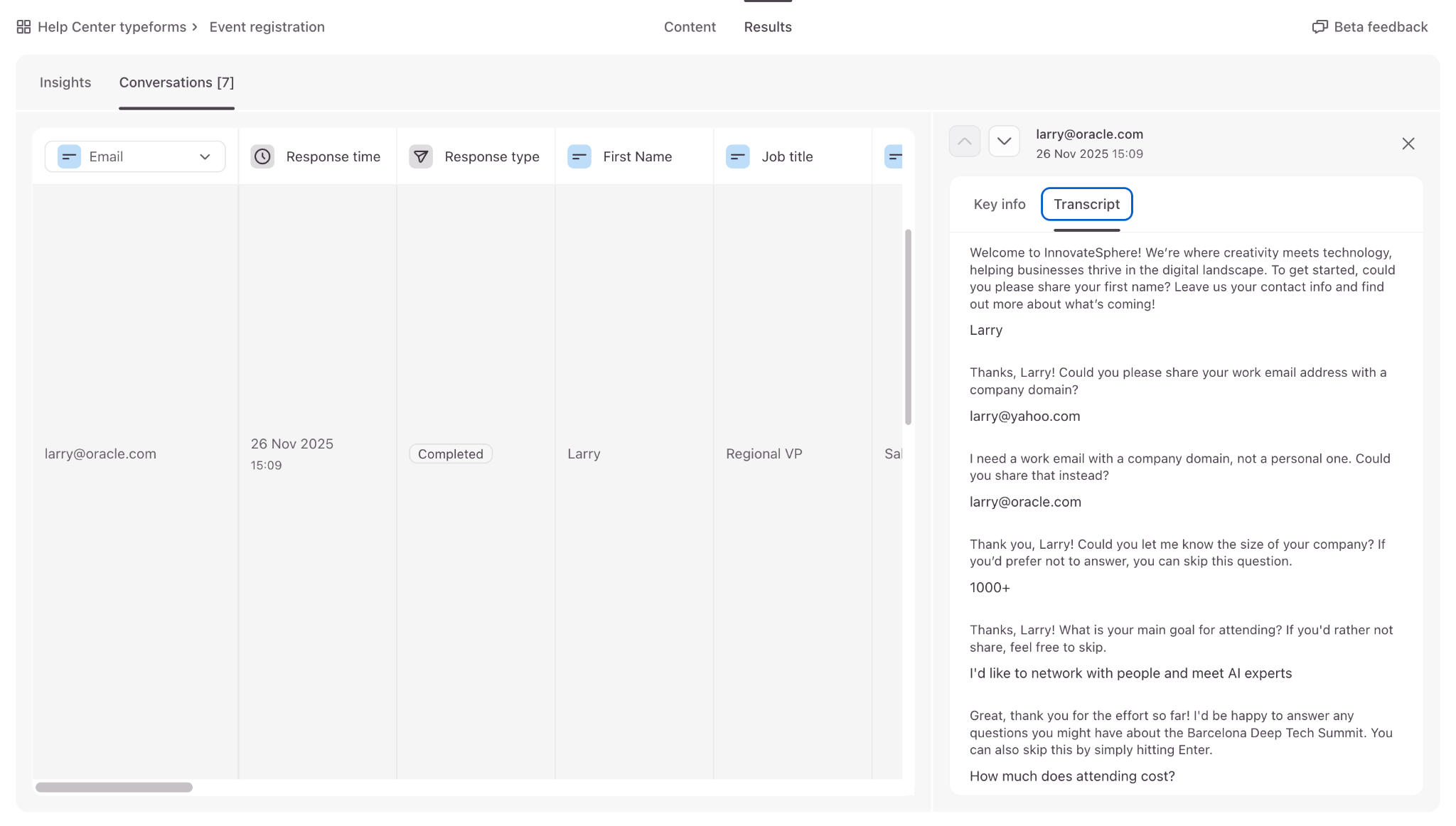 Once people start interacting with your agent, you’ll be able to view and inspect conversation data including key information collected, and the full transcript of conversations people had with the agent.