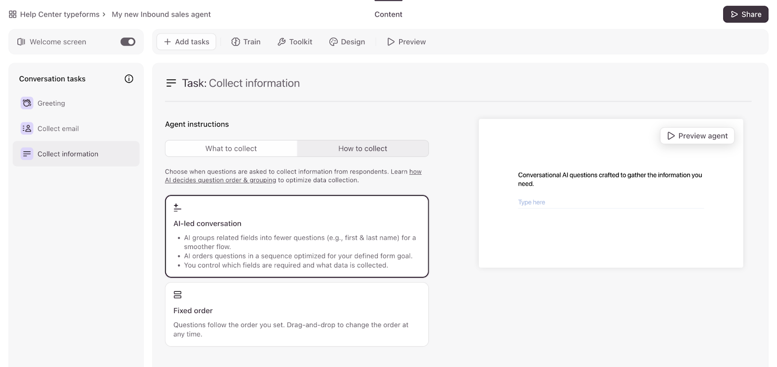 - In this example, we’ve selected the AI-led conversation. You’ll also see a tooltip letting you know that AI will arrange and group your question for the best flow.