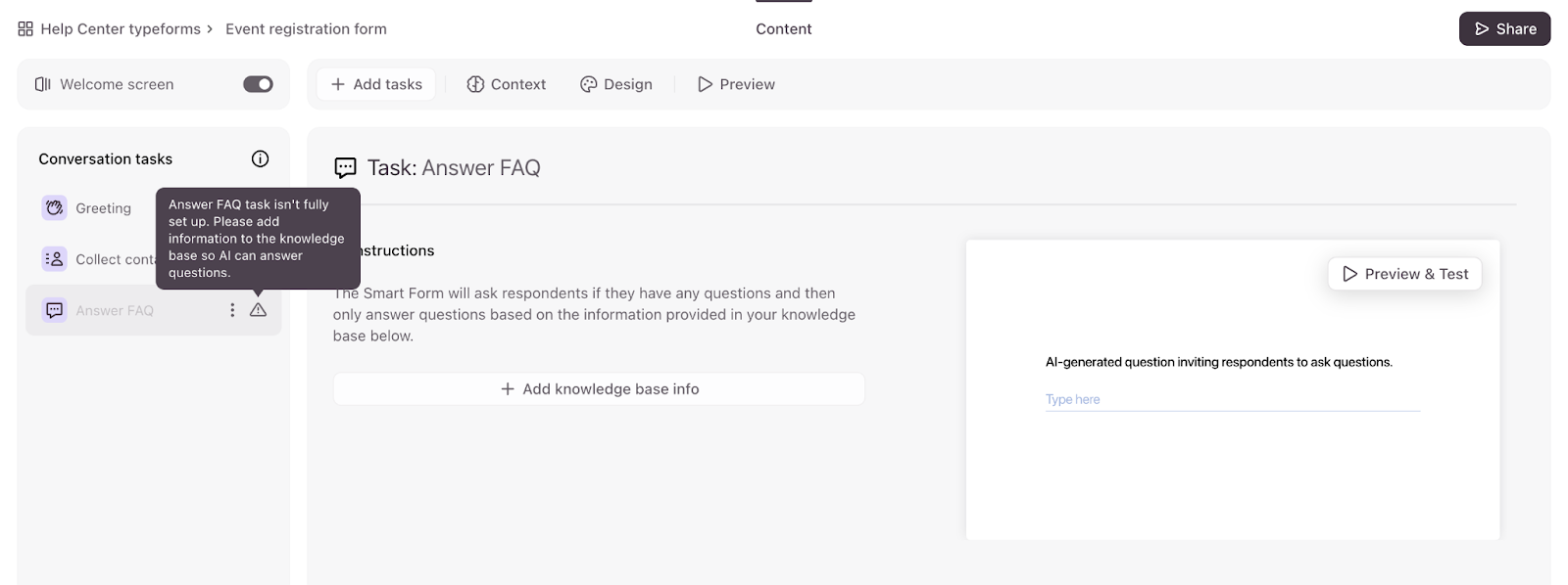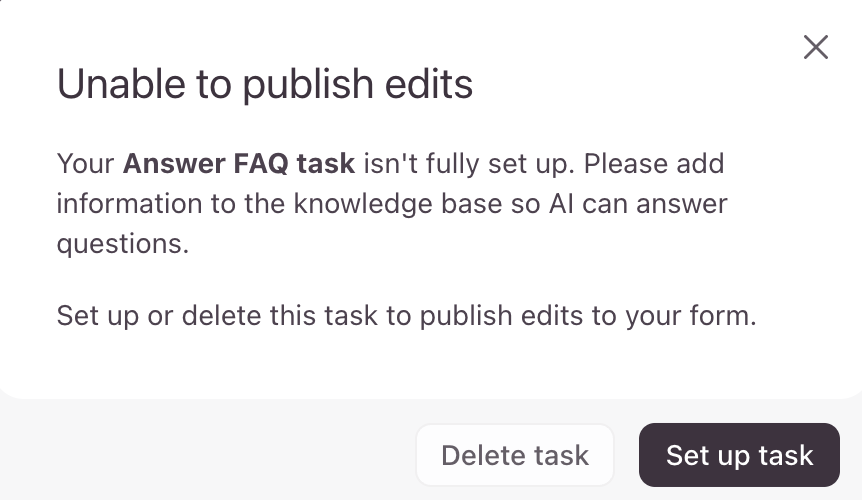You won’t be able to publish and share your Smart Form until you upload an AI knowledge base to the Answer FAQ task. You can click Set up task in the warning message to add your knowledge base, or Delete task if you don’t want to use a knowledge base.