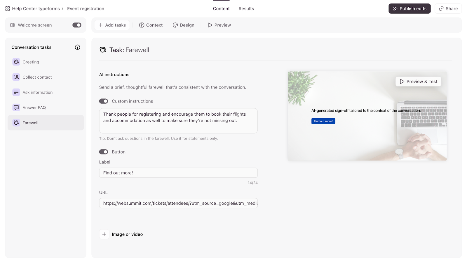 - You can customize this just like the Welcome Screen. Toggle the Custom instructions switch to add some instructions for the farewell message, edit the button text, add a redirect URL, or spice it up with an image or video. You can also click Design to apply a theme to the Ending task.
