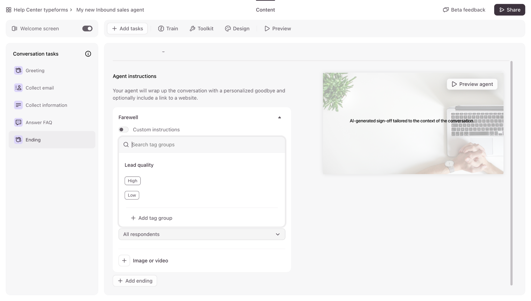- Finally, you can add an Ending task to your agent to say farewell to your audience.