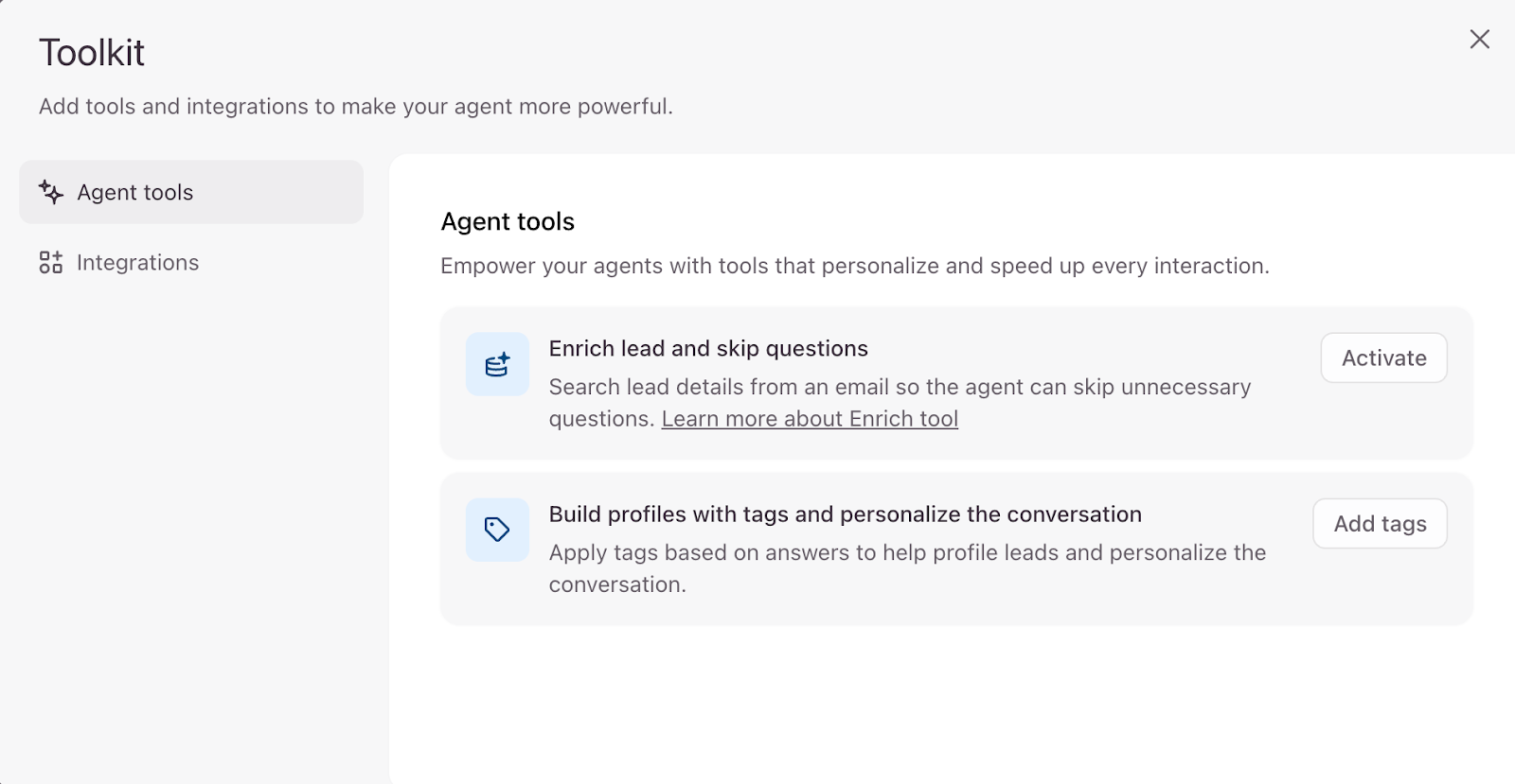 You can also click Integrations in your agent Toolkit to make the agent even more powerful by connecting it to external apps.