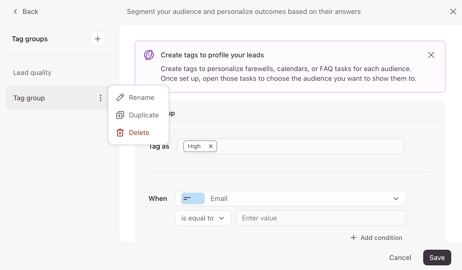 You can also choose to send your calendar invite to all of your respondents, or only to respondents who meet certain criteria. You can create tag groups to segment your audience by things like their lead status or any other category. Click + Add tag group to create a new tag group. You can find out more about creating tag groups here.