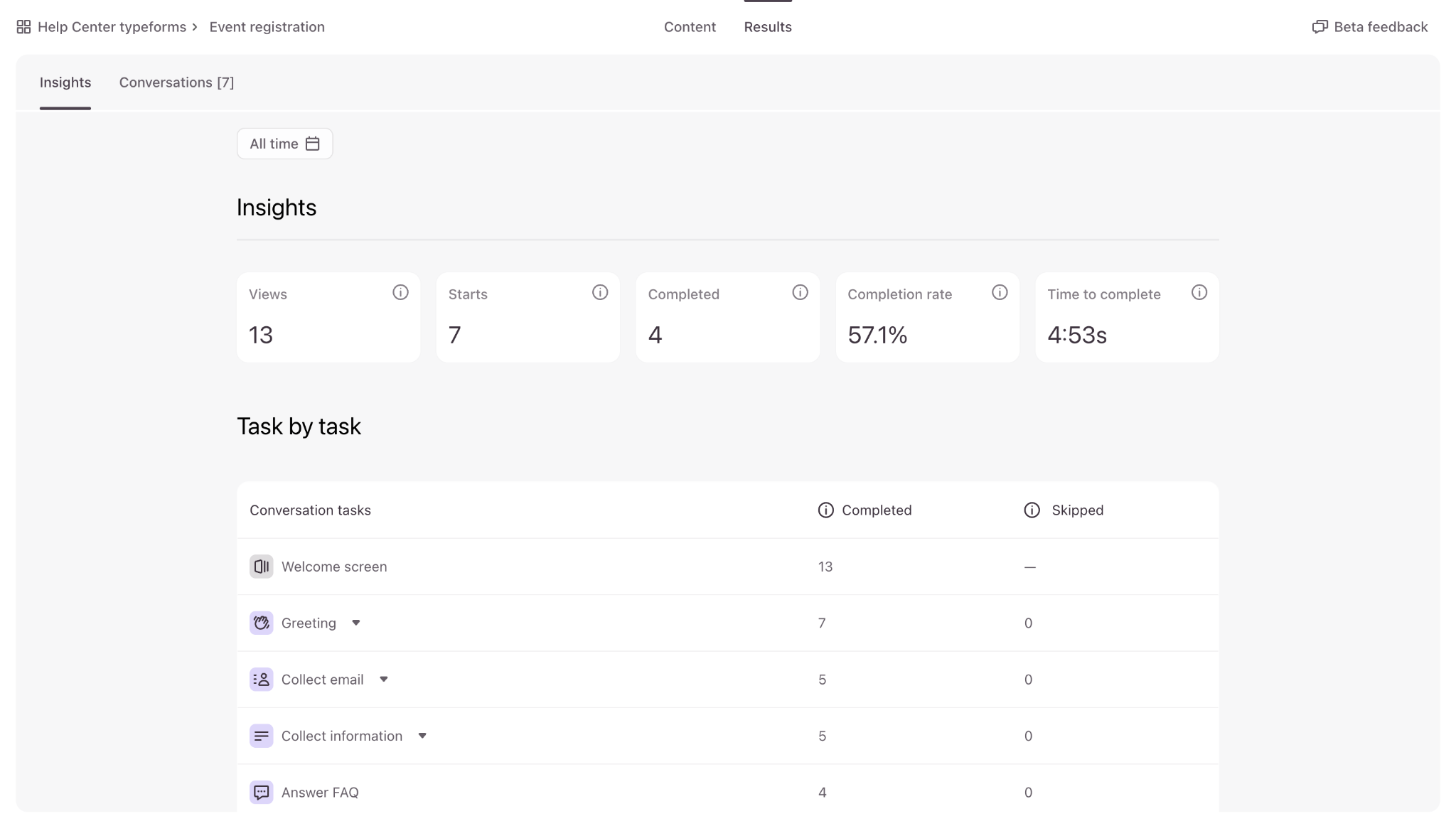In your Results Insights, you’ll see how many times people have interacted with your agent, and which tasks they’ve completed or skipped.