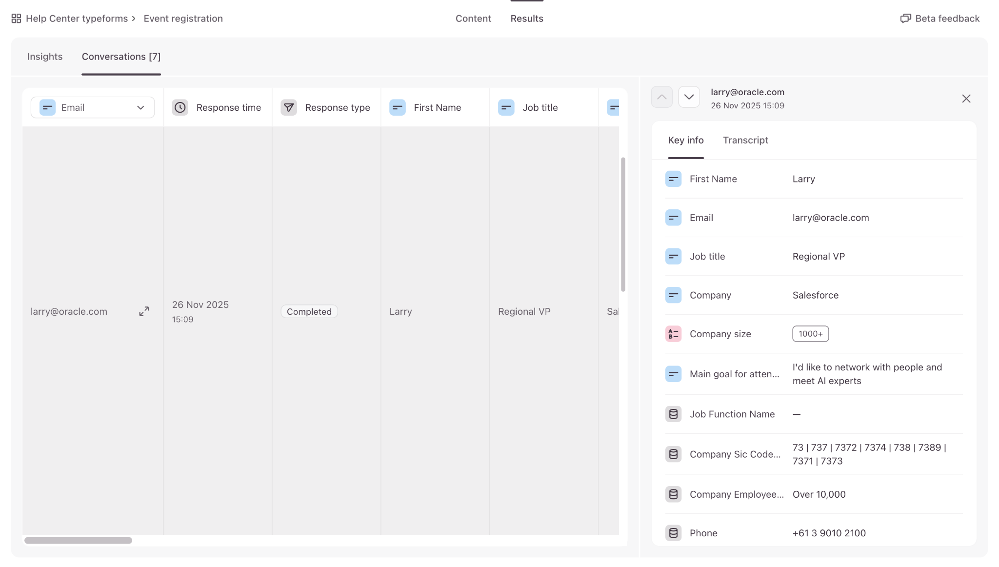Each Response contains a Key Info section with the answers submitted by your respondents. The Key Info section also contains all the enrichment information your agent has collected during the conversation with your respondents.