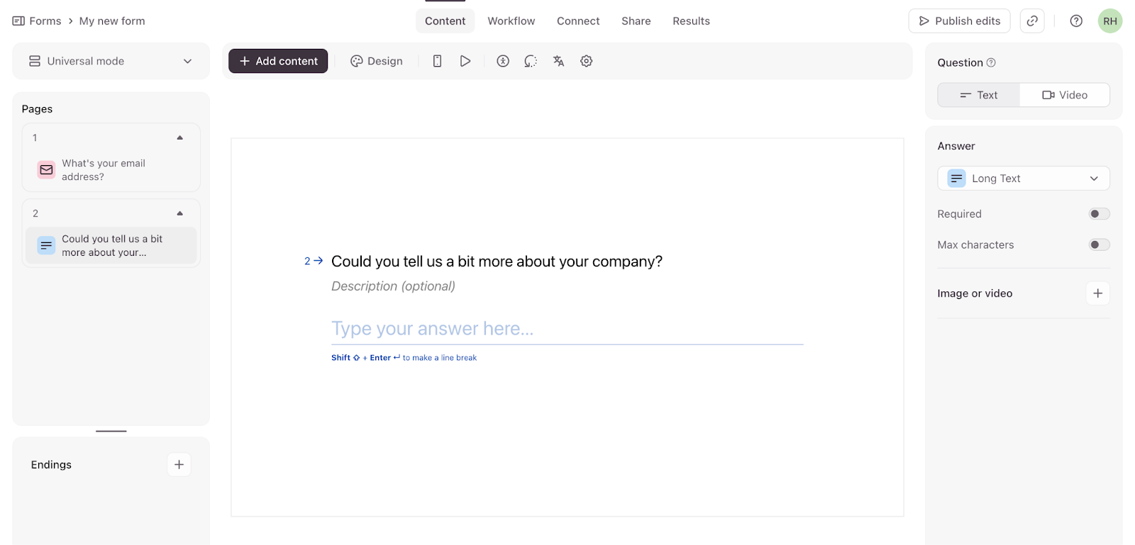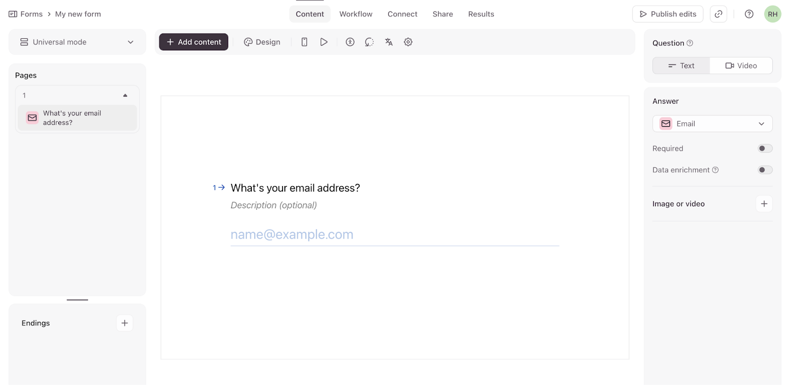- Add some questions that you can map to a task in Asana. For example, you can add an Email question to make the email address of your respondent a task in Asana.
