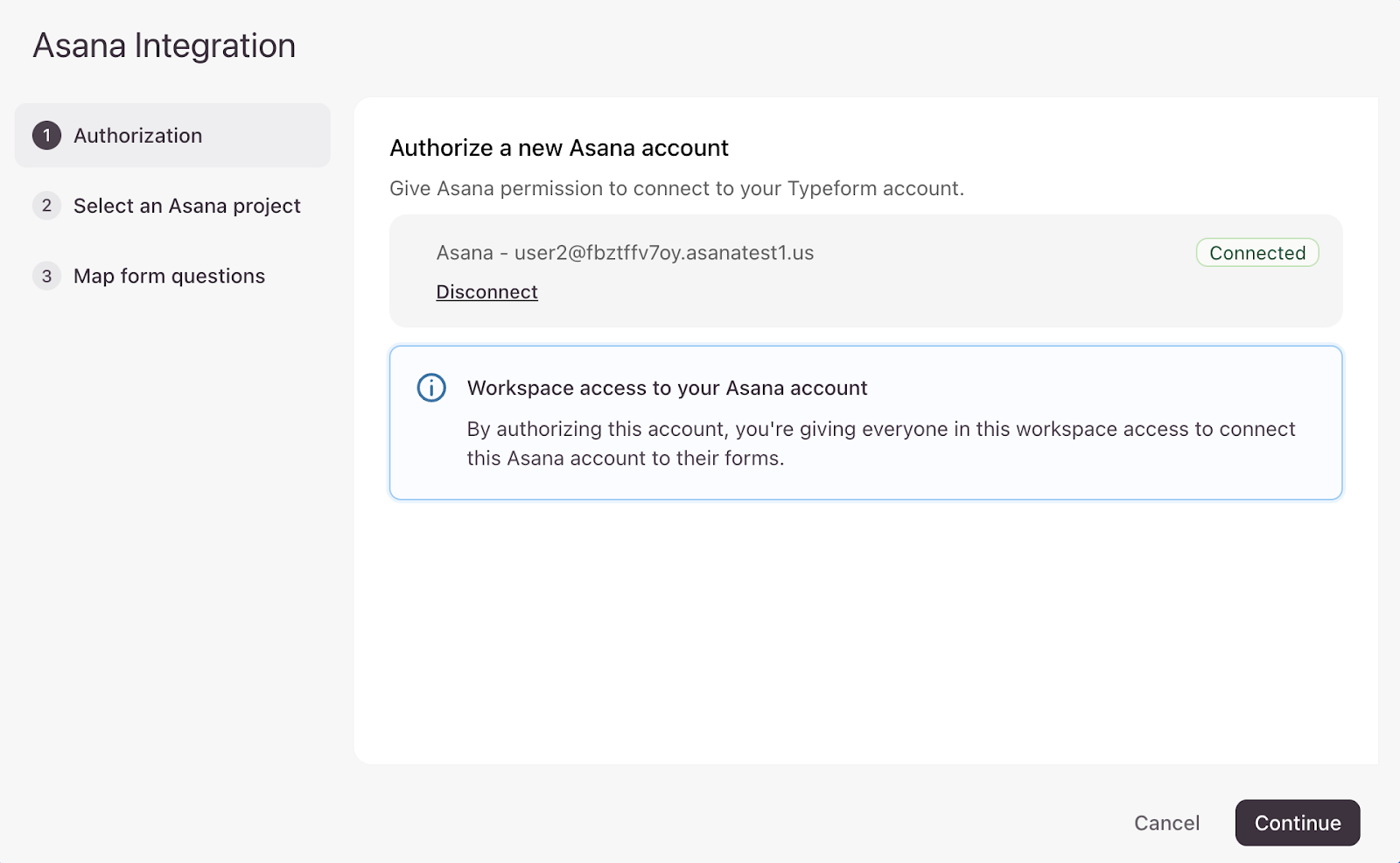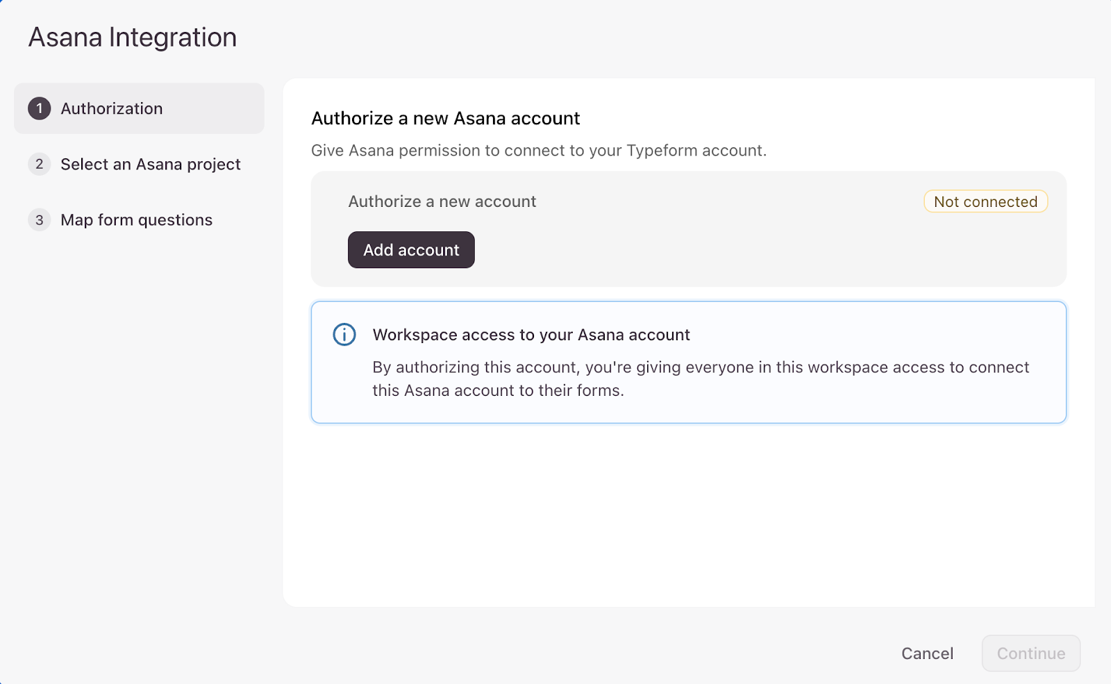 - Click Add account to connect your Asana account. By authorizing your account, you’re giving everyone in your Typeform workspace access to the Asana account you’ve connected.