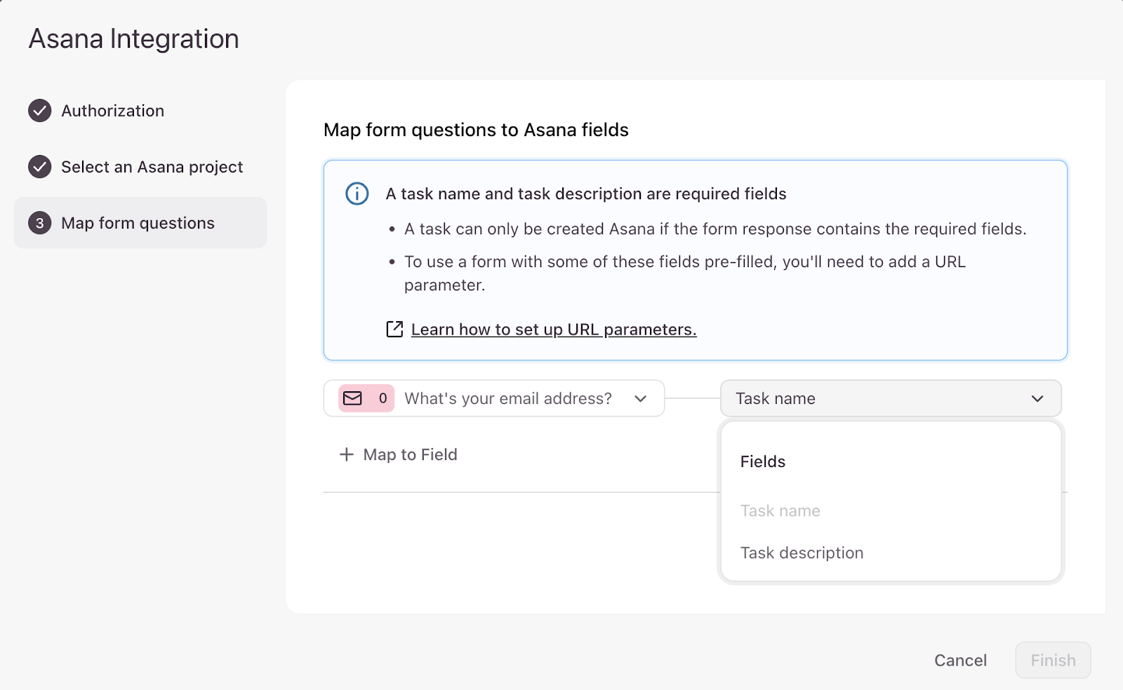 Note: Currently, you can only map to the Task name and Task descriptions fields in Asana.