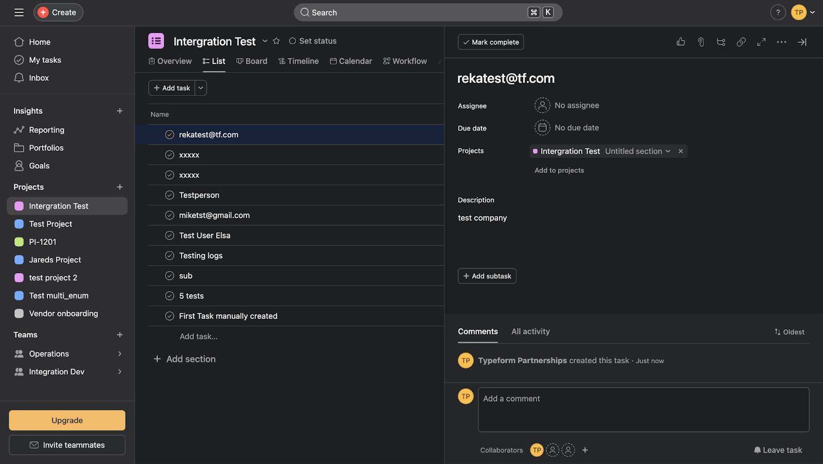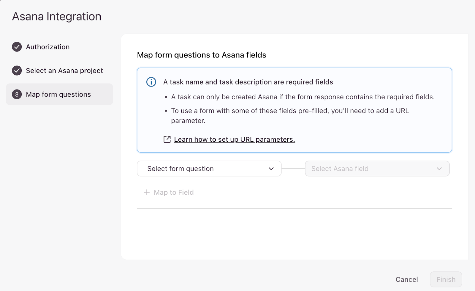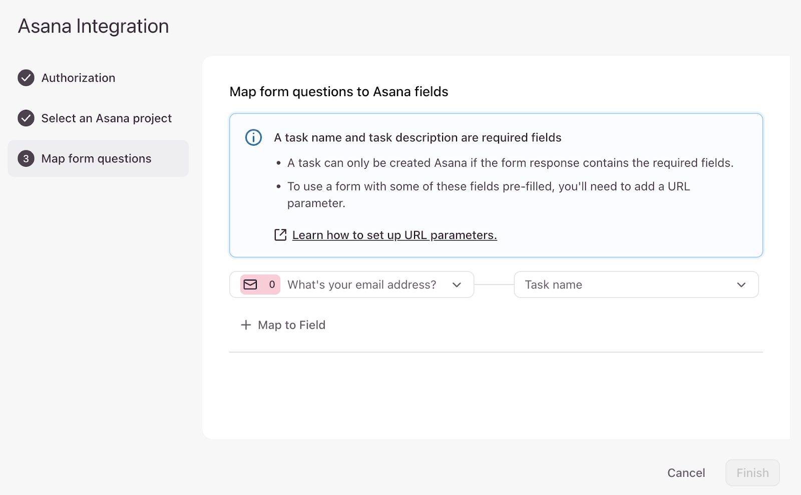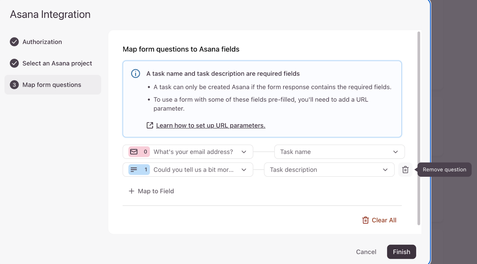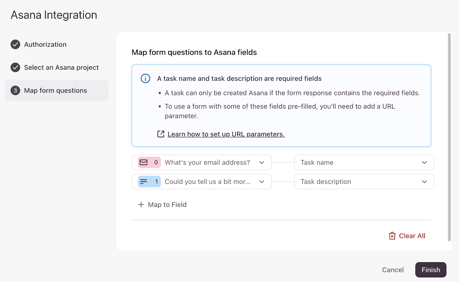 With this integration, you can map your Typeform questions to the Task and Task description fields in Asana.