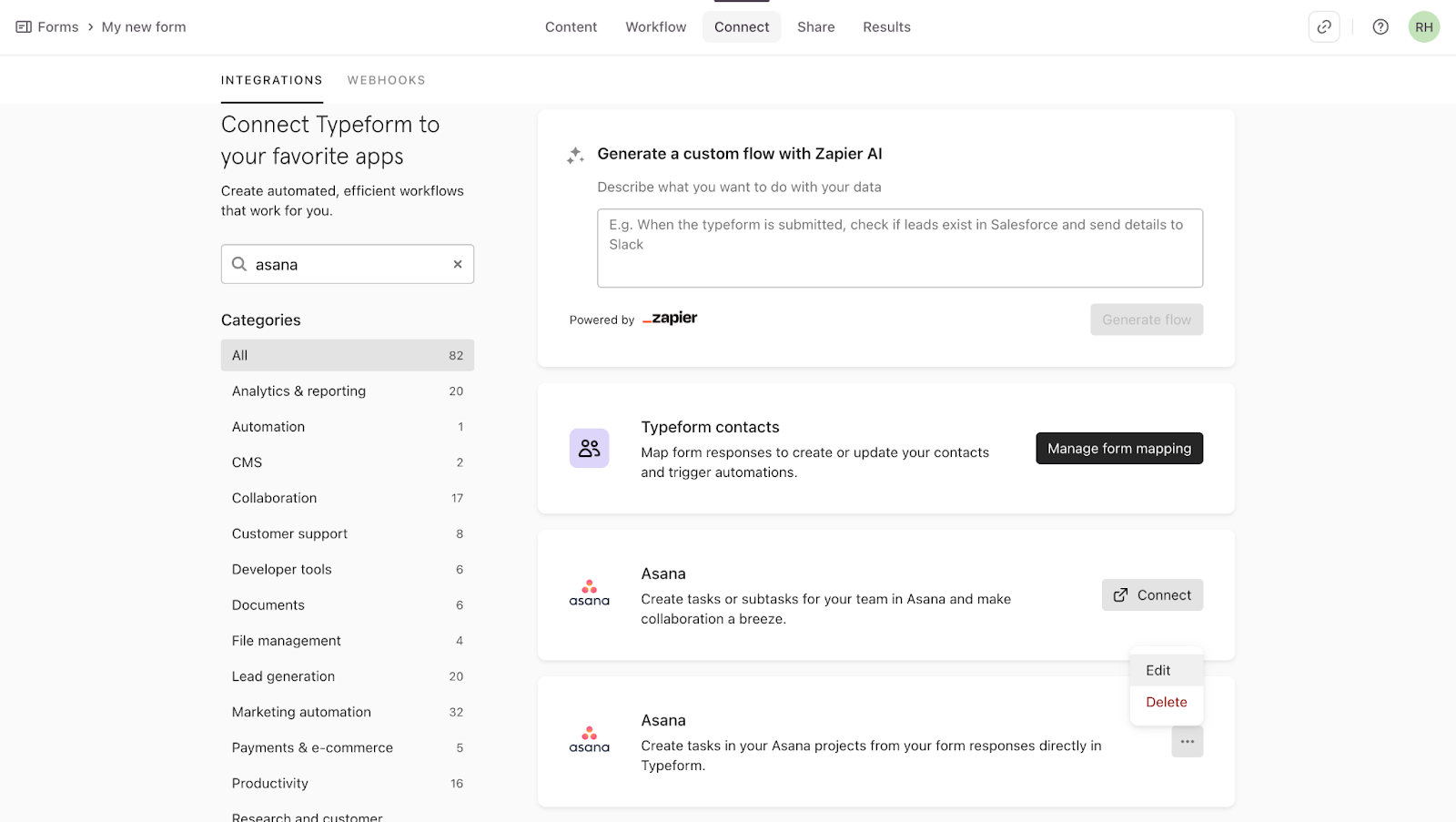 Now you’ll see that your form has been connected to Asana. You can click the three dots to edit or delete it.