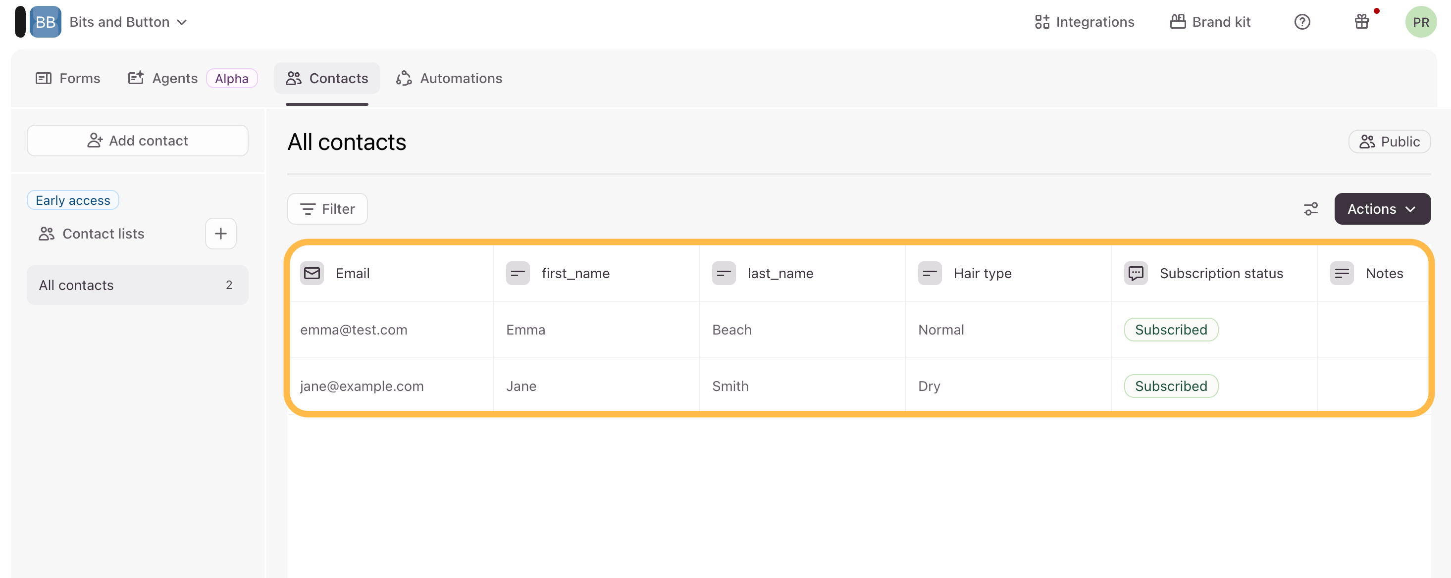 - Filter your Contacts by specific criteria (e.g. all customers with dry hair type).