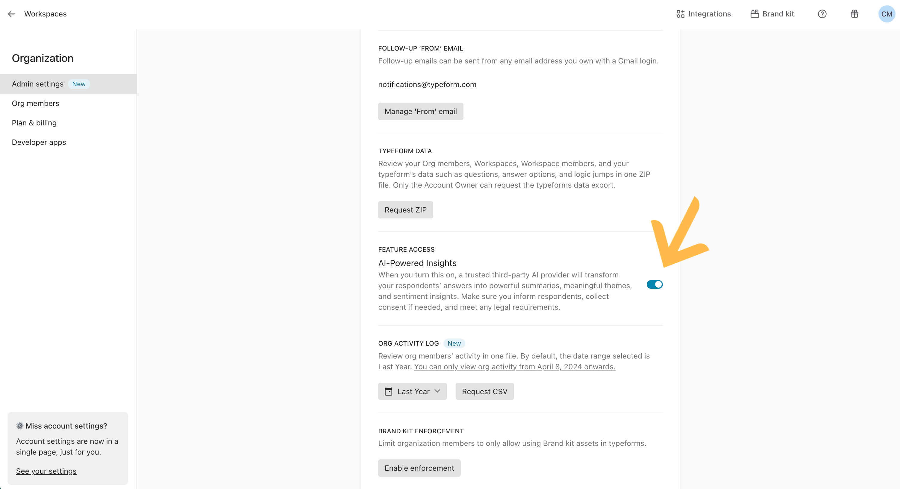 You must be an Admin or Owner in your organization to turn the AI-Powered Insights option on or off.