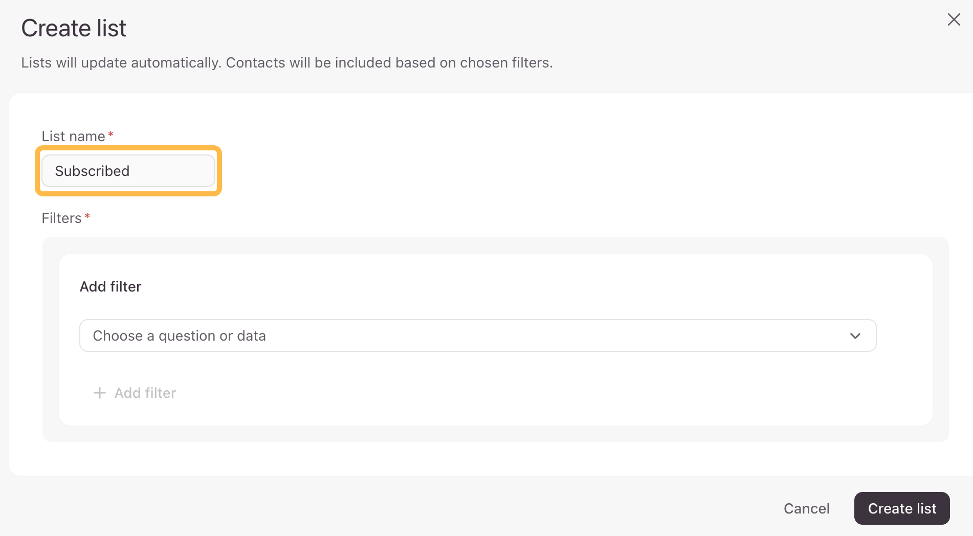 3. Enter the name you want to give your list. We’ll enter Subscribed.