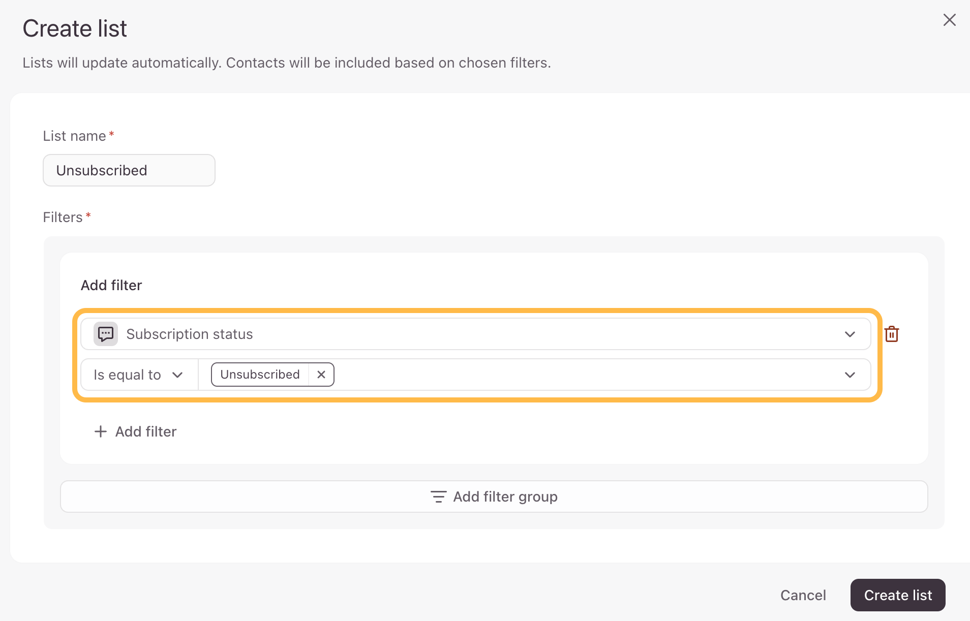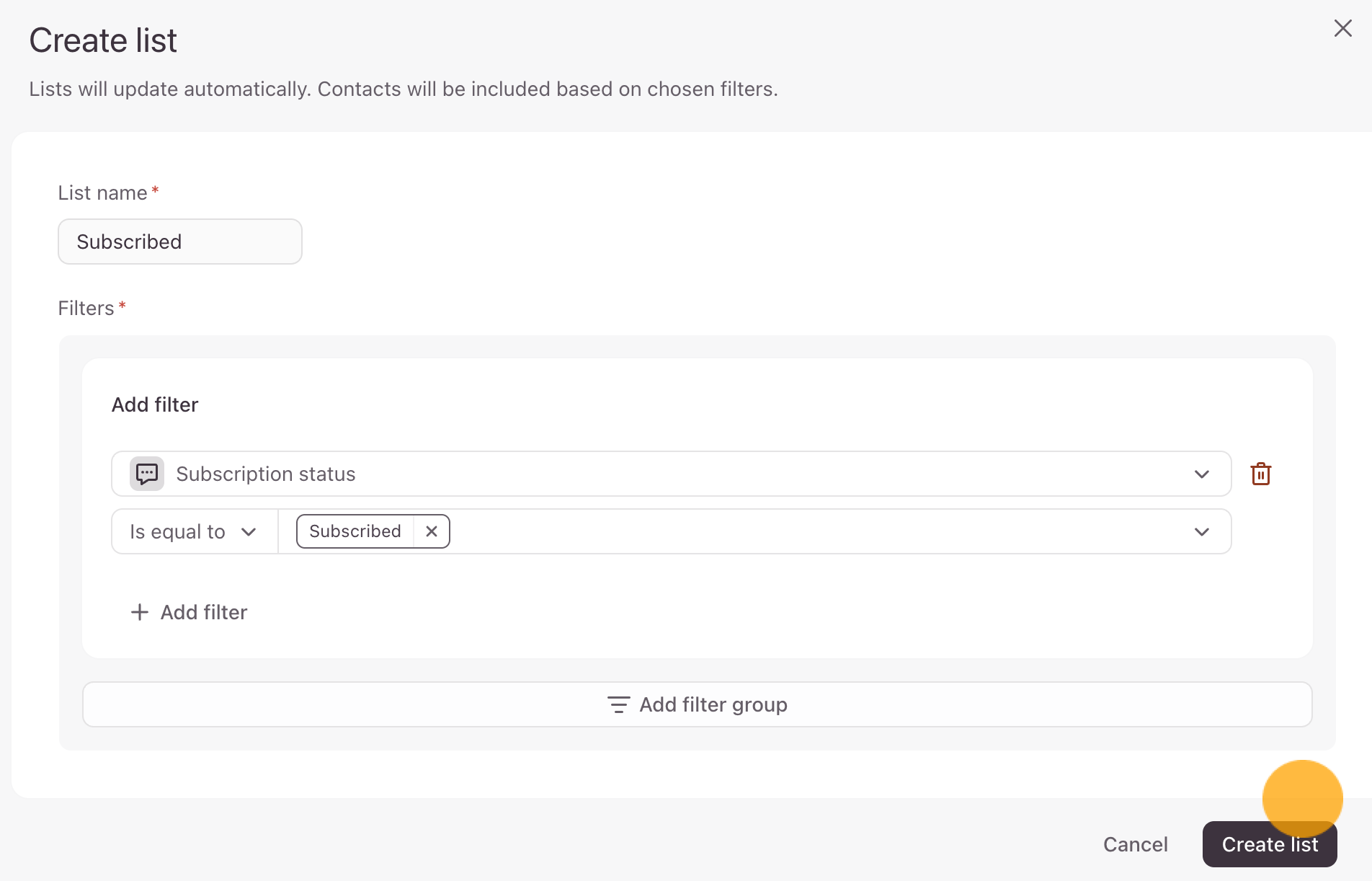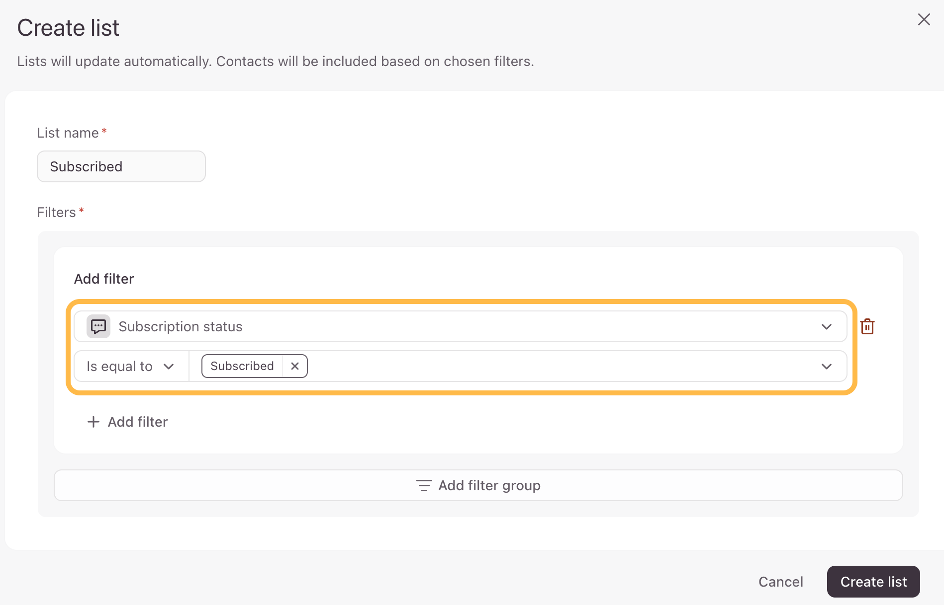 4. In the Add filter dropdown, select what you would like to filter this contact list by. We’ll select to filter by Subscription status is equal to Subscribed.