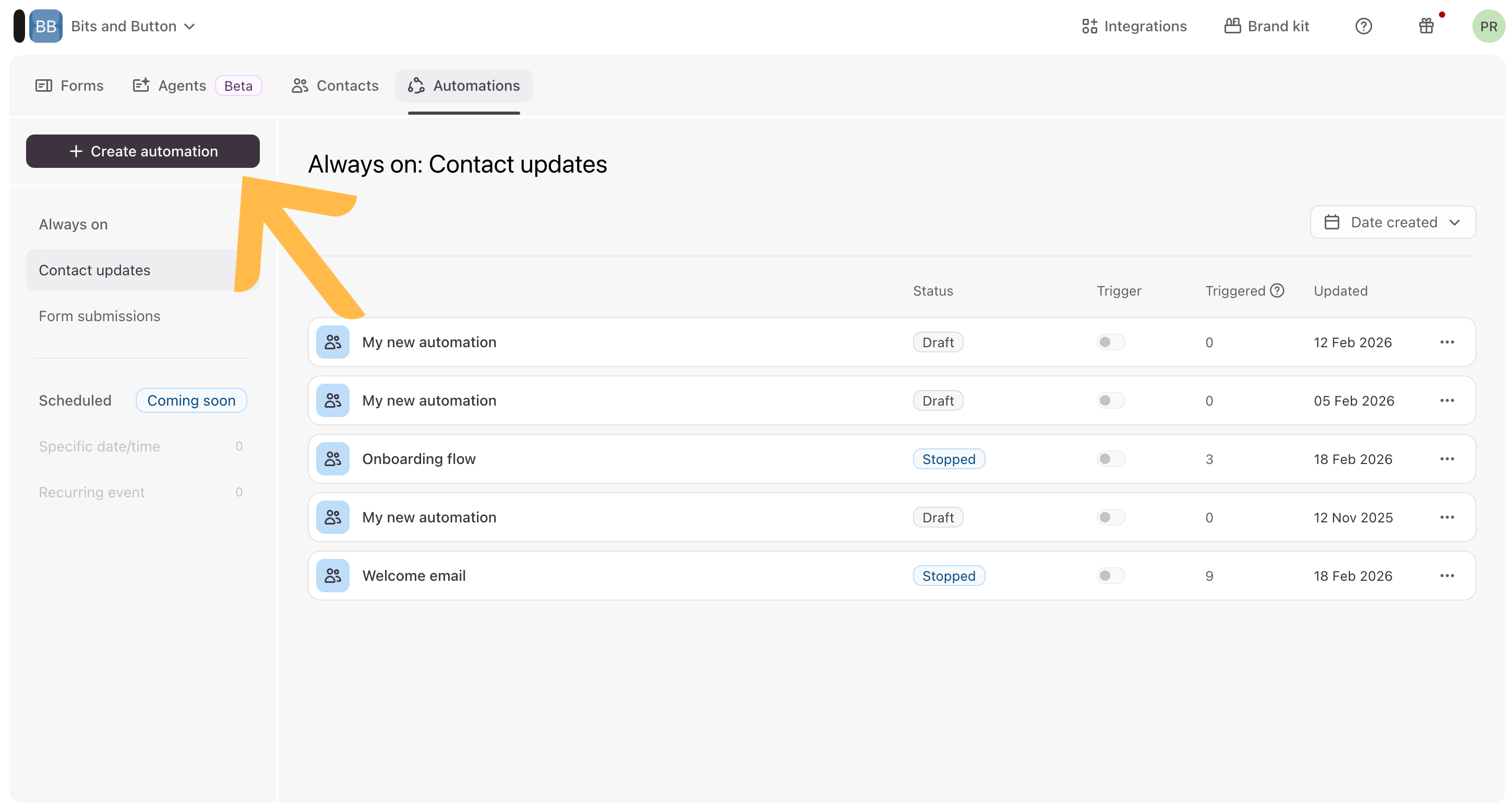 2. Click + Create automation.