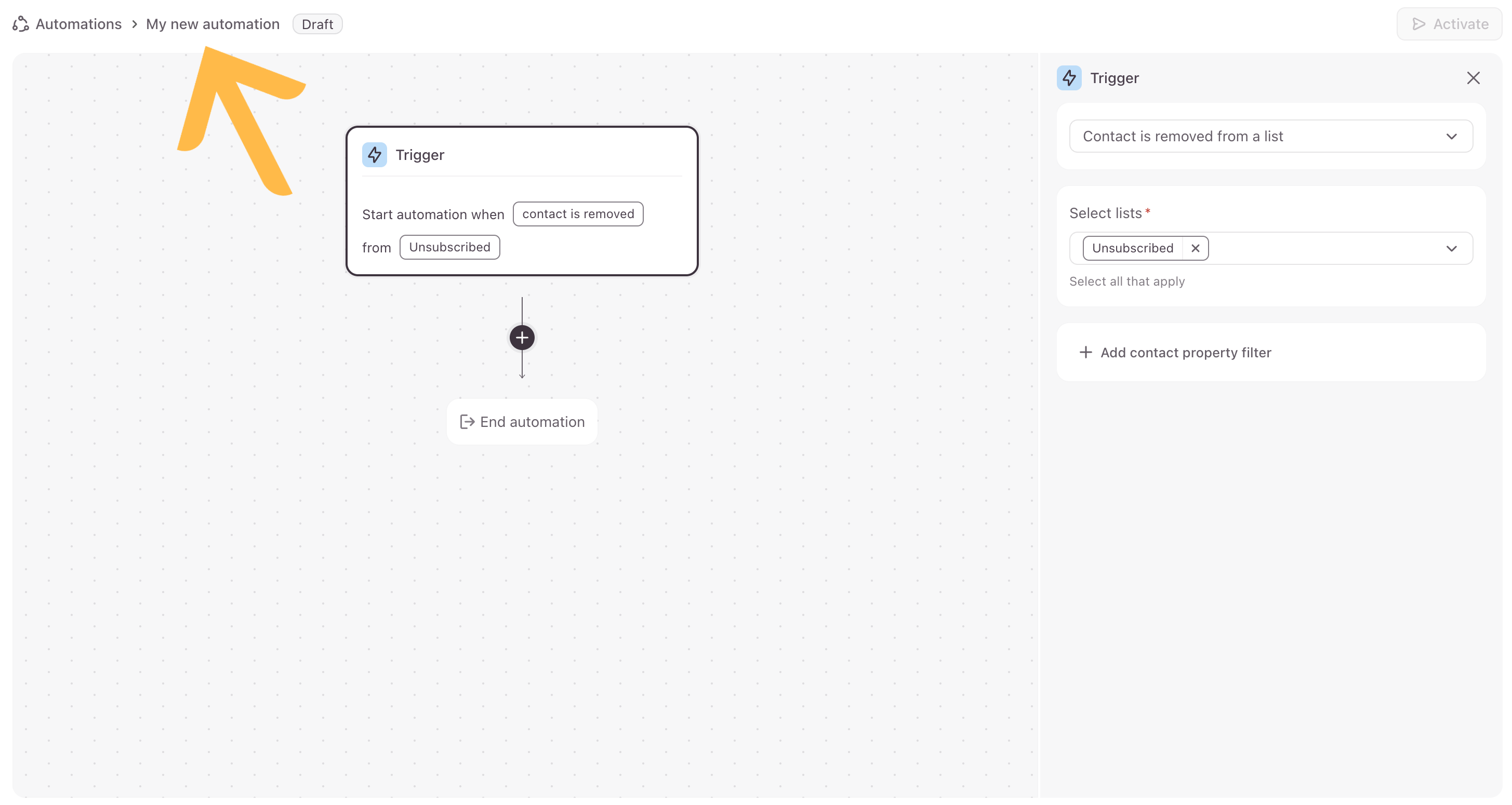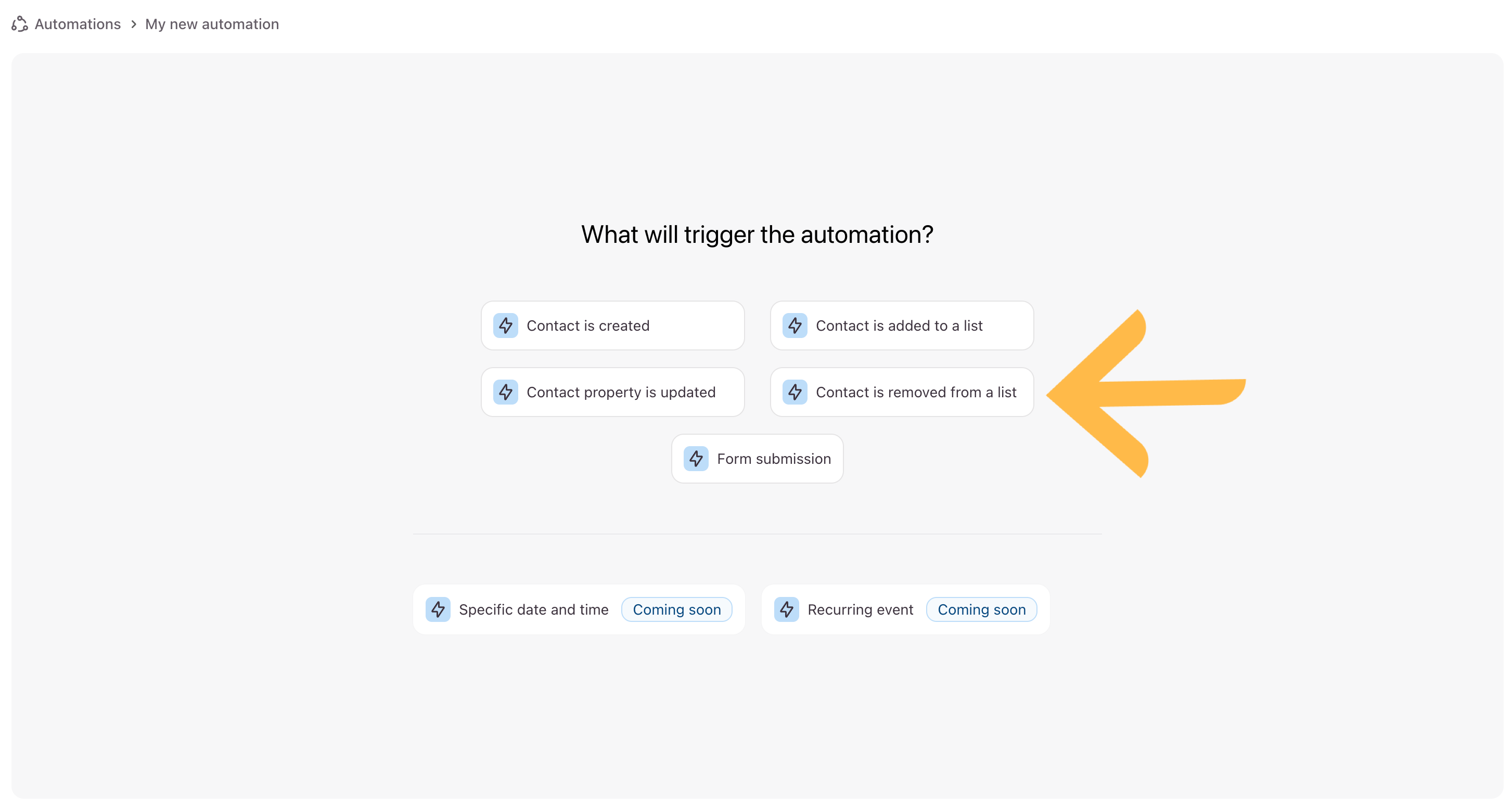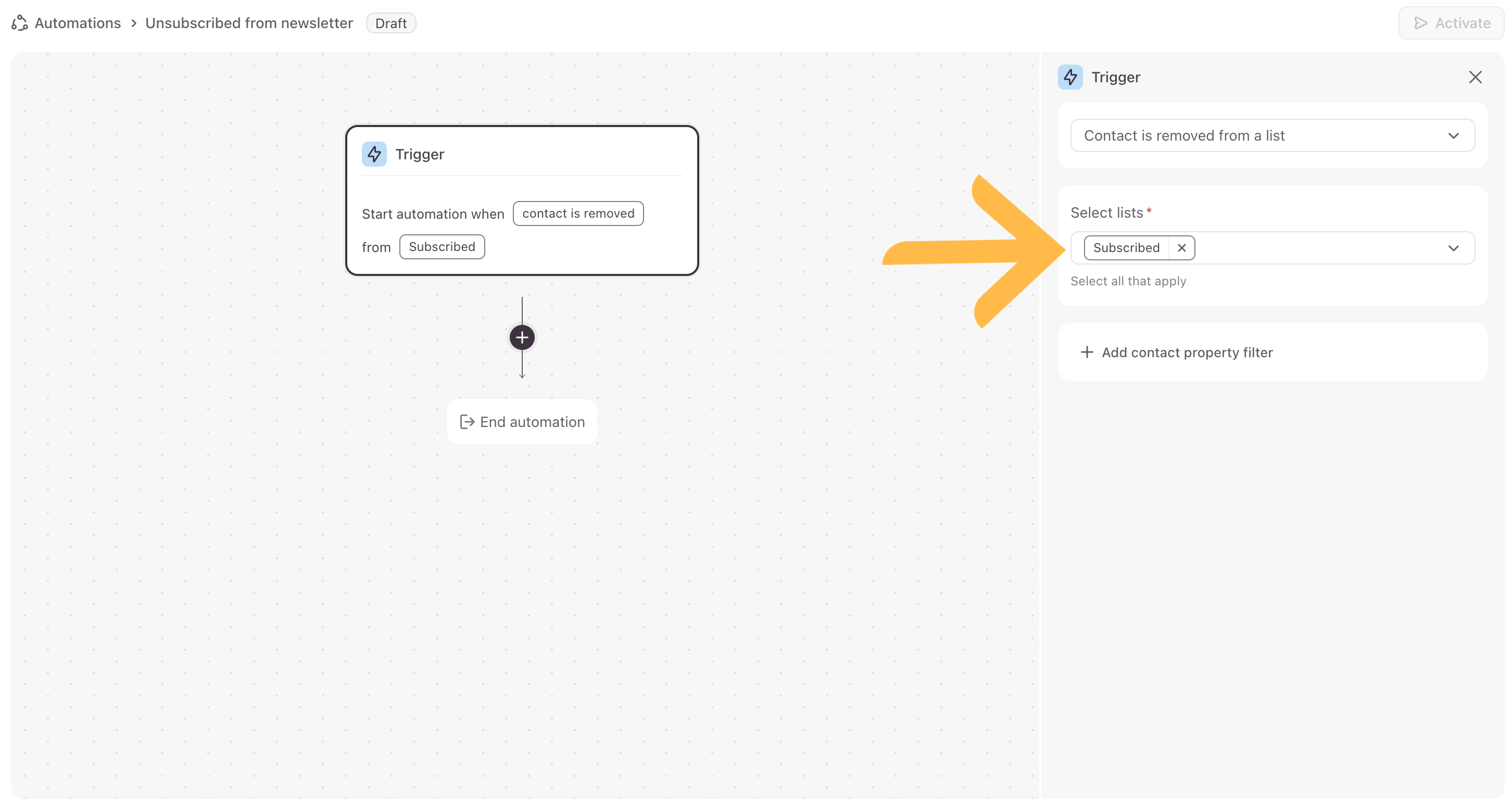 3. Select what will trigger the automation. We’ll select Contact is removed from a list.