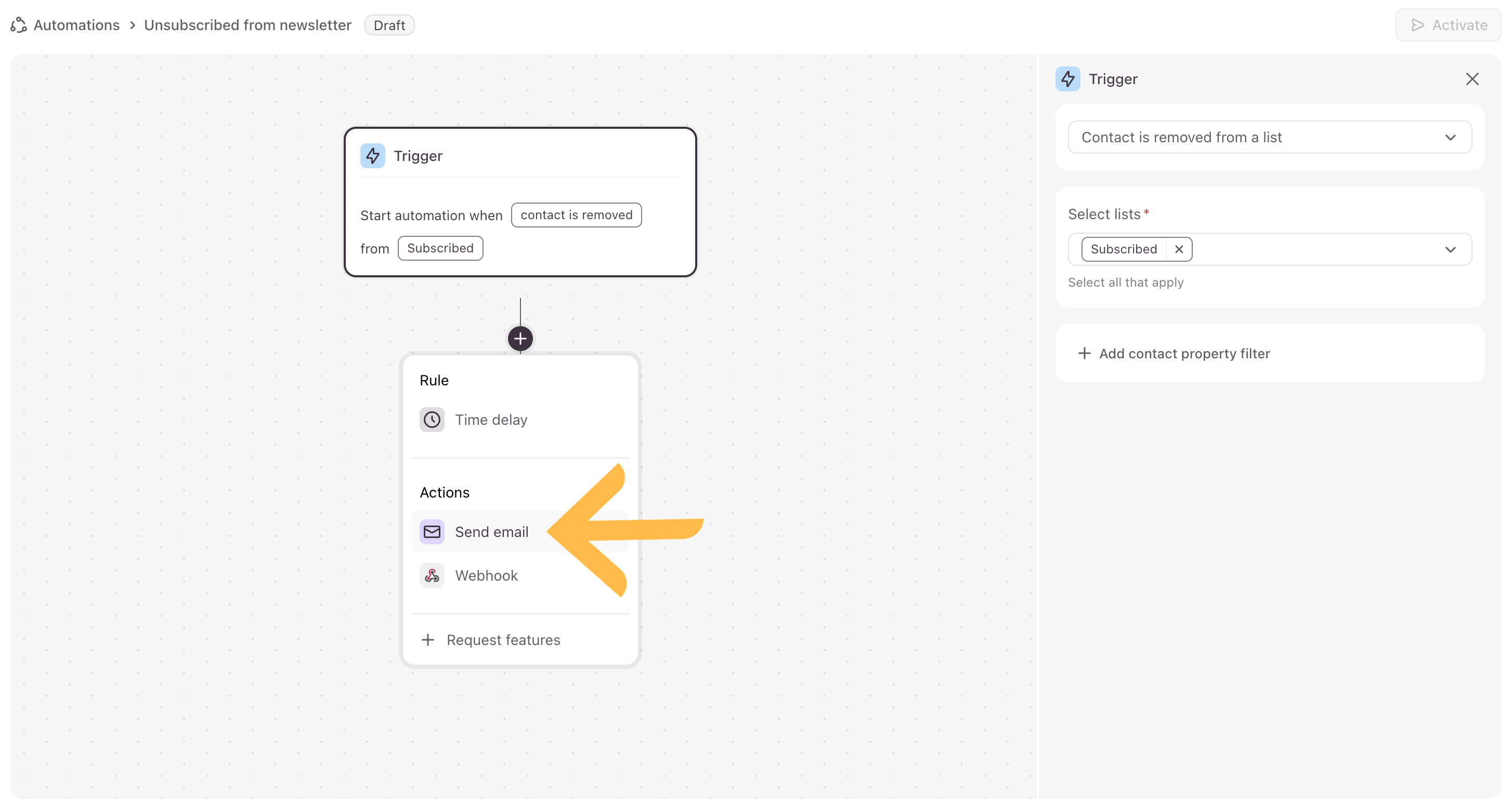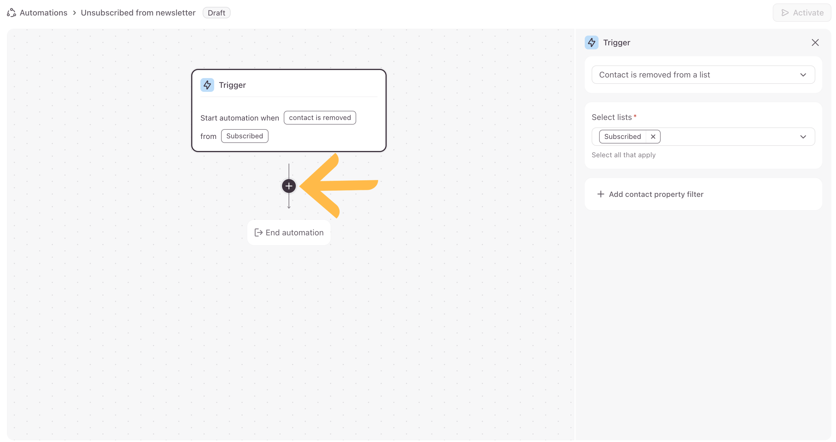 In this article, we’ll explain how to create an automation when a contact is removed from a contact list. We’ll use an example of a newsletter sign up form for when people want to subscribe or unsubscribe from a newsletter mailing list. You can follow the steps in this article for how to create an automation for when a contact is removed and adjust it to fit your use case.