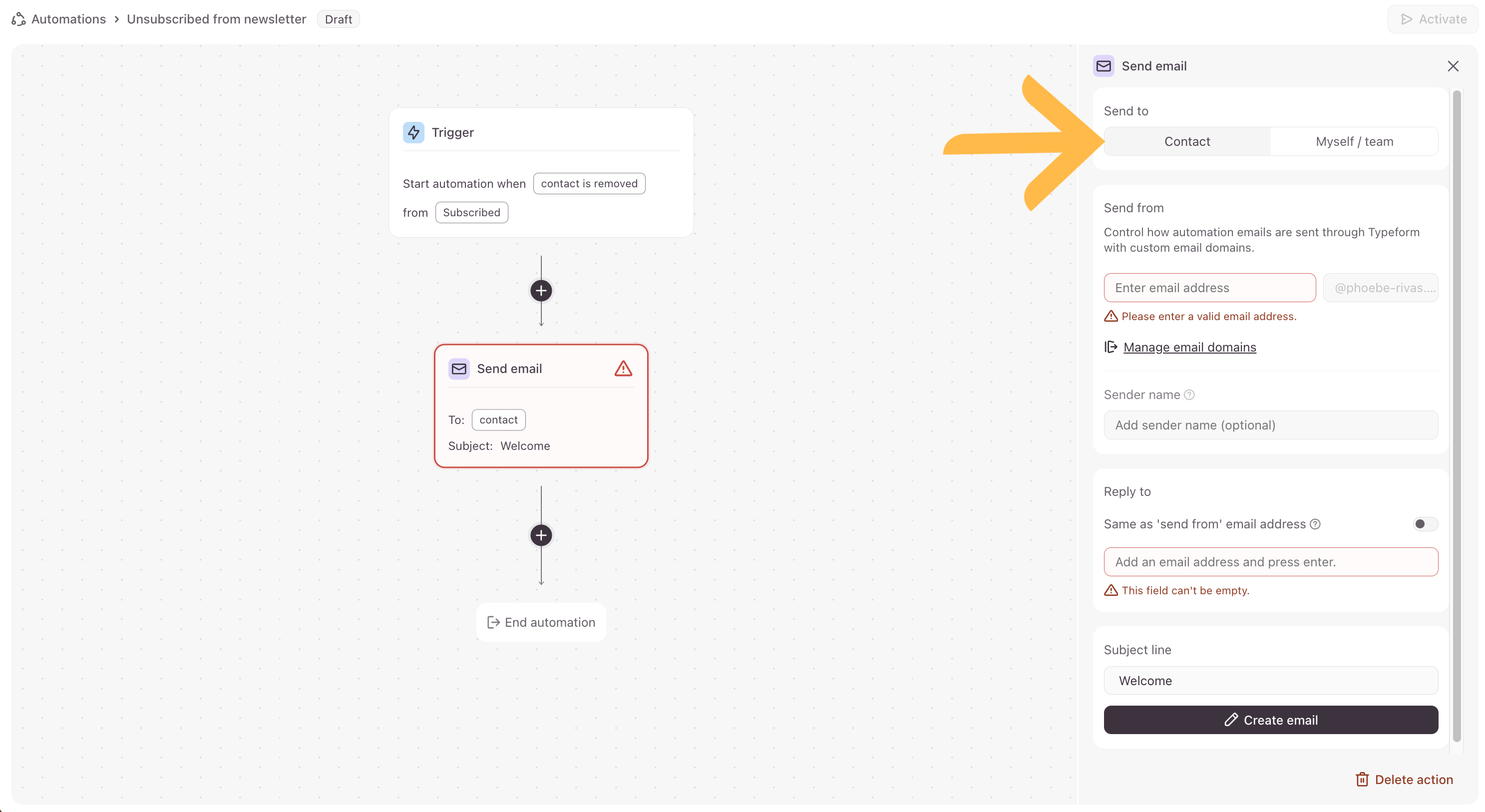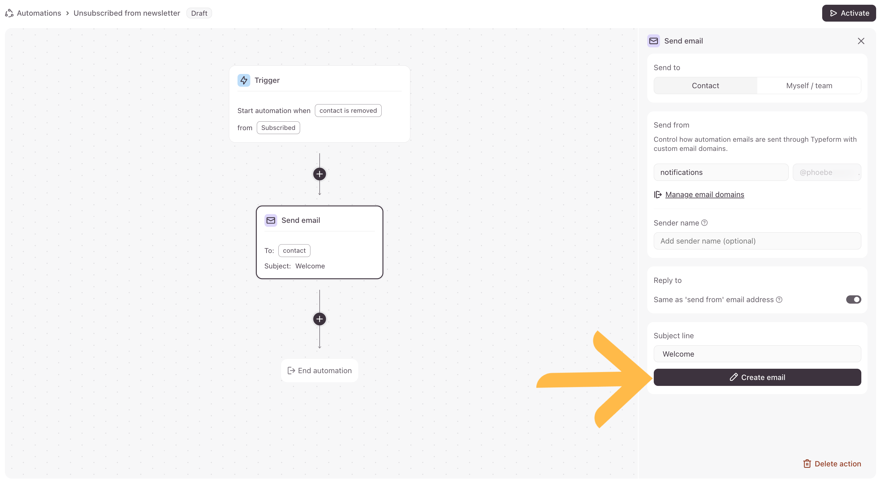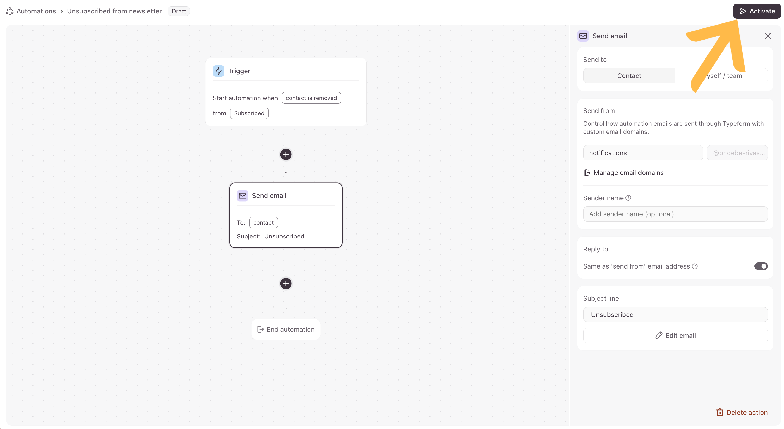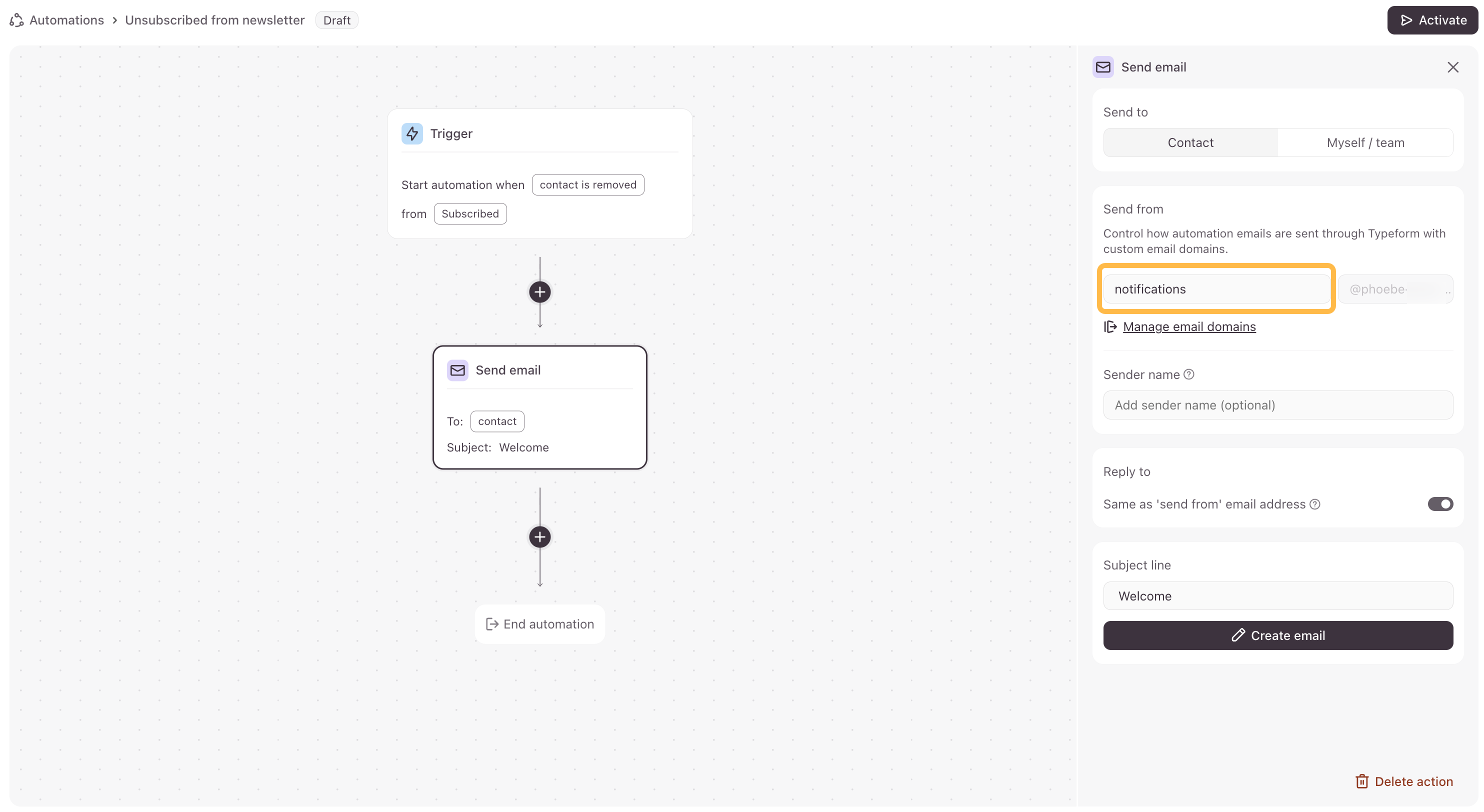 Note! Emails sent from automations will need to be sent from a custom email domain. Check out this article for instructions on how to set up a custom email domain in your Typeform account.
