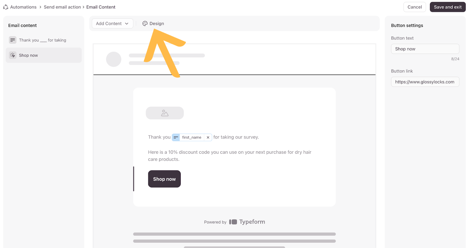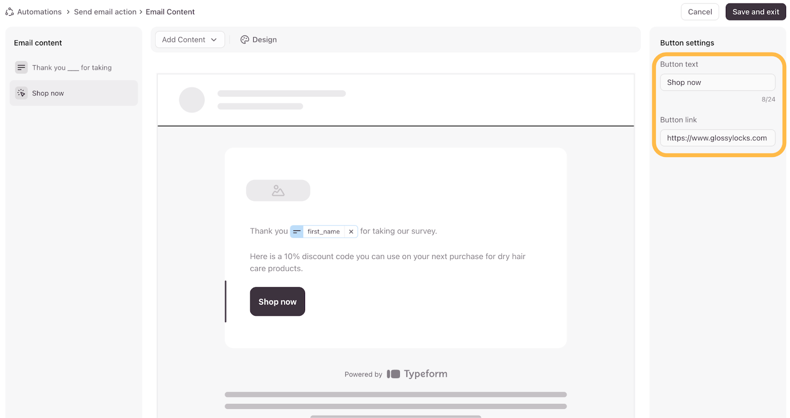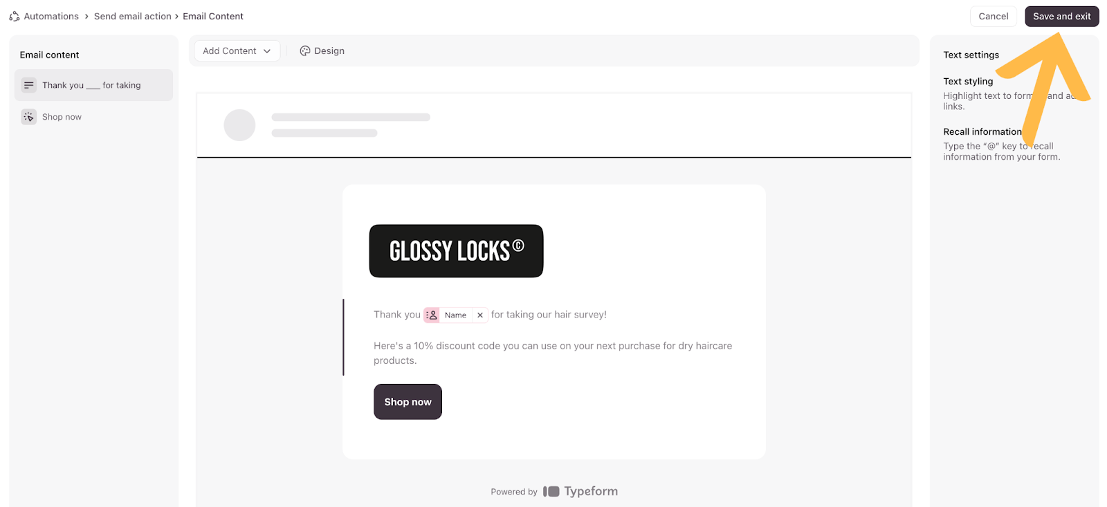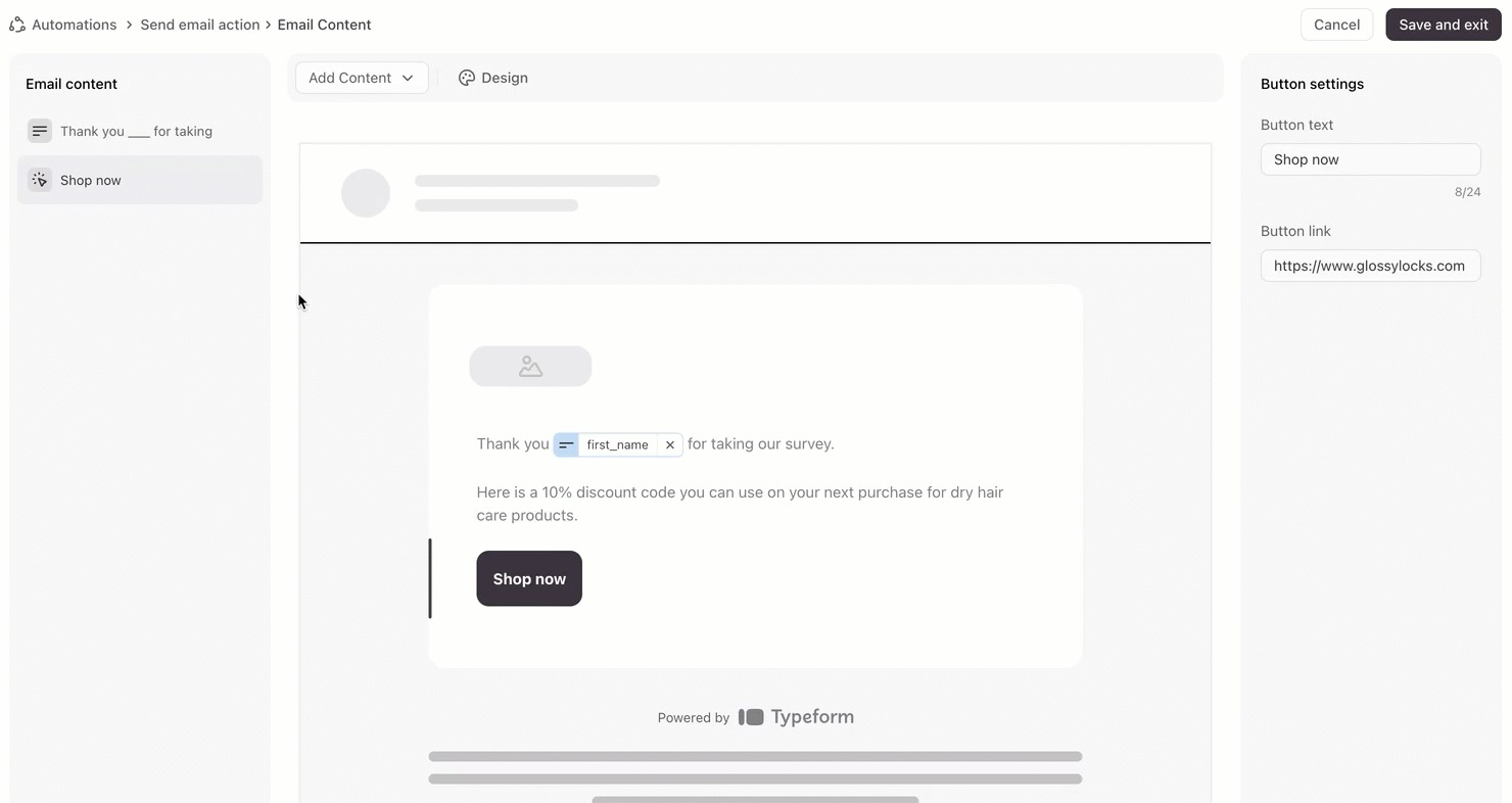 - Your theme will be applied to the email automatically. When you're happy with your email, click Save and exit to continue building your automation.