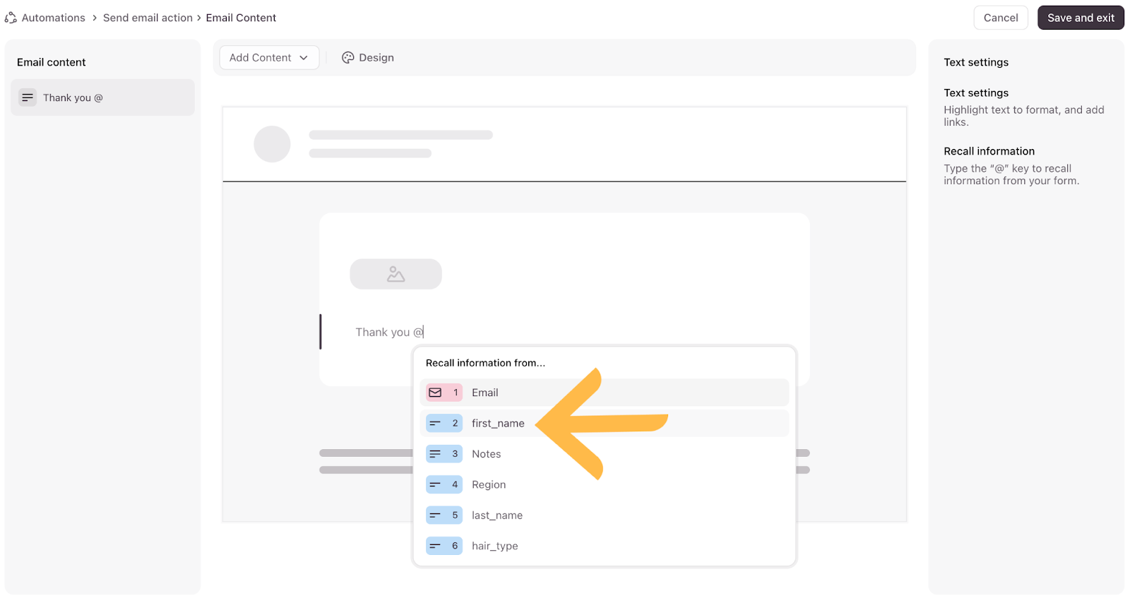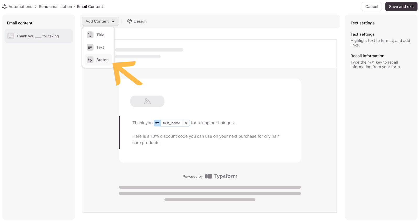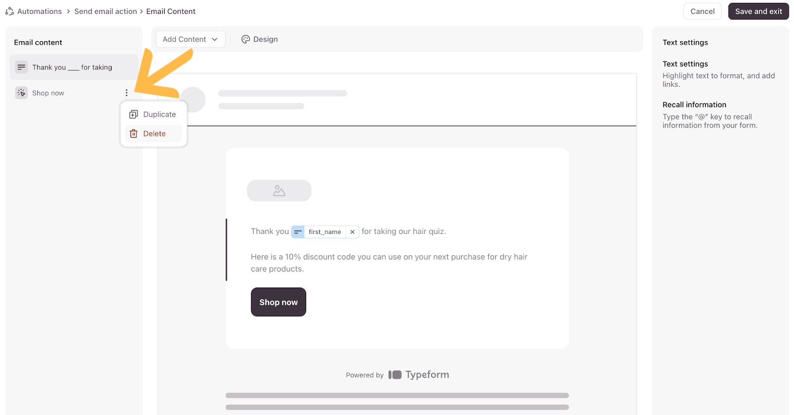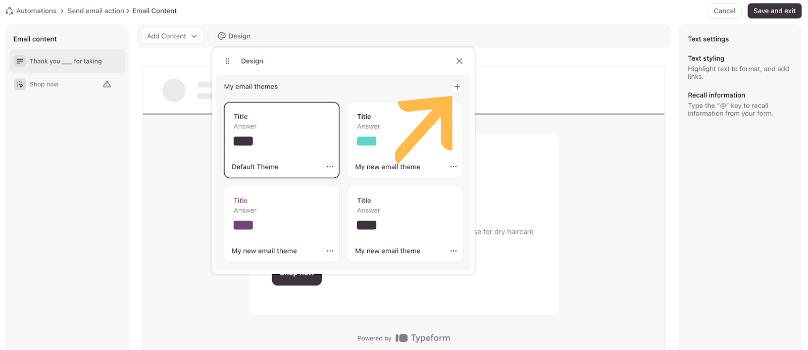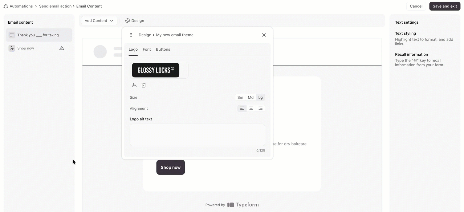 - Your theme will be applied to the email automatically. When you're happy with your email, click Save and exit to continue building your automation.