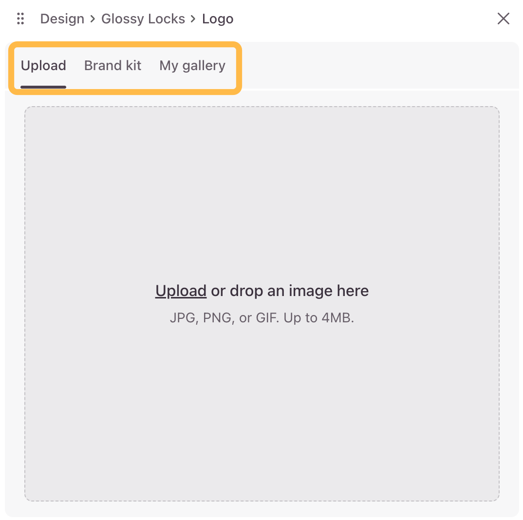 - You can choose to Upload your logo, select a logo from a Brand kit, or choose a logo from My gallery. You can upload a logo in JPG, PNG, or GIF format and up to 4MB in size.