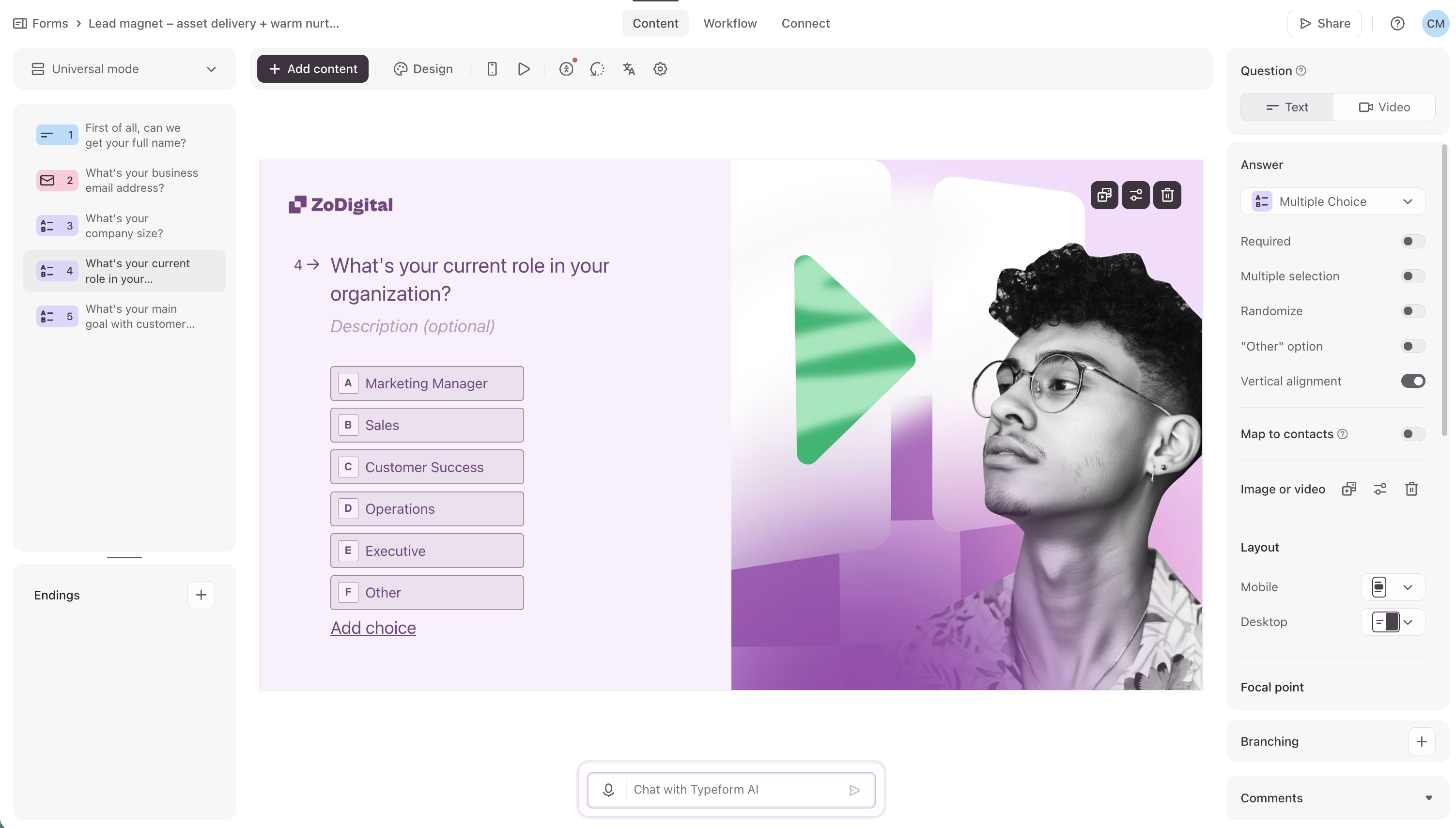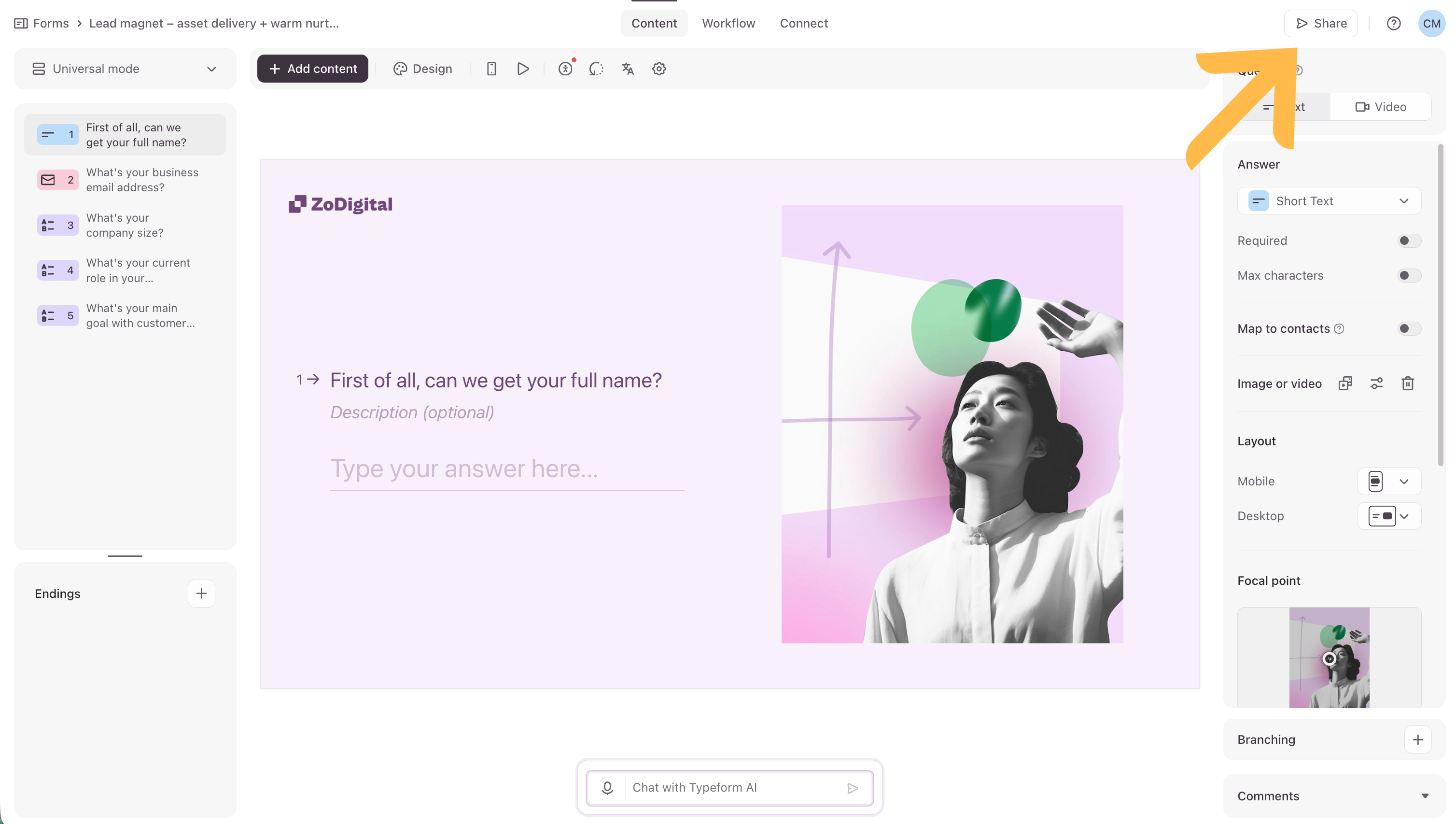 - Let Typeform AI generate the draft form. Review the questions and remove anything not essential for first contact. Keep at least: