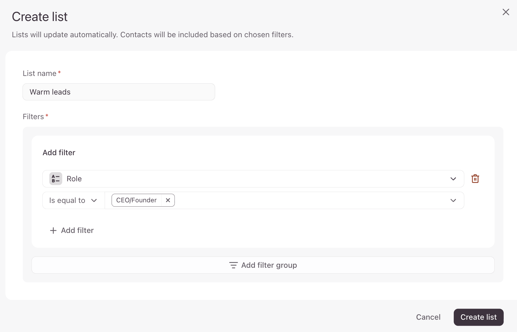 In our example, we’ll create a Warm leads list for respondents whose mapped Job role property is CEO/Founder.