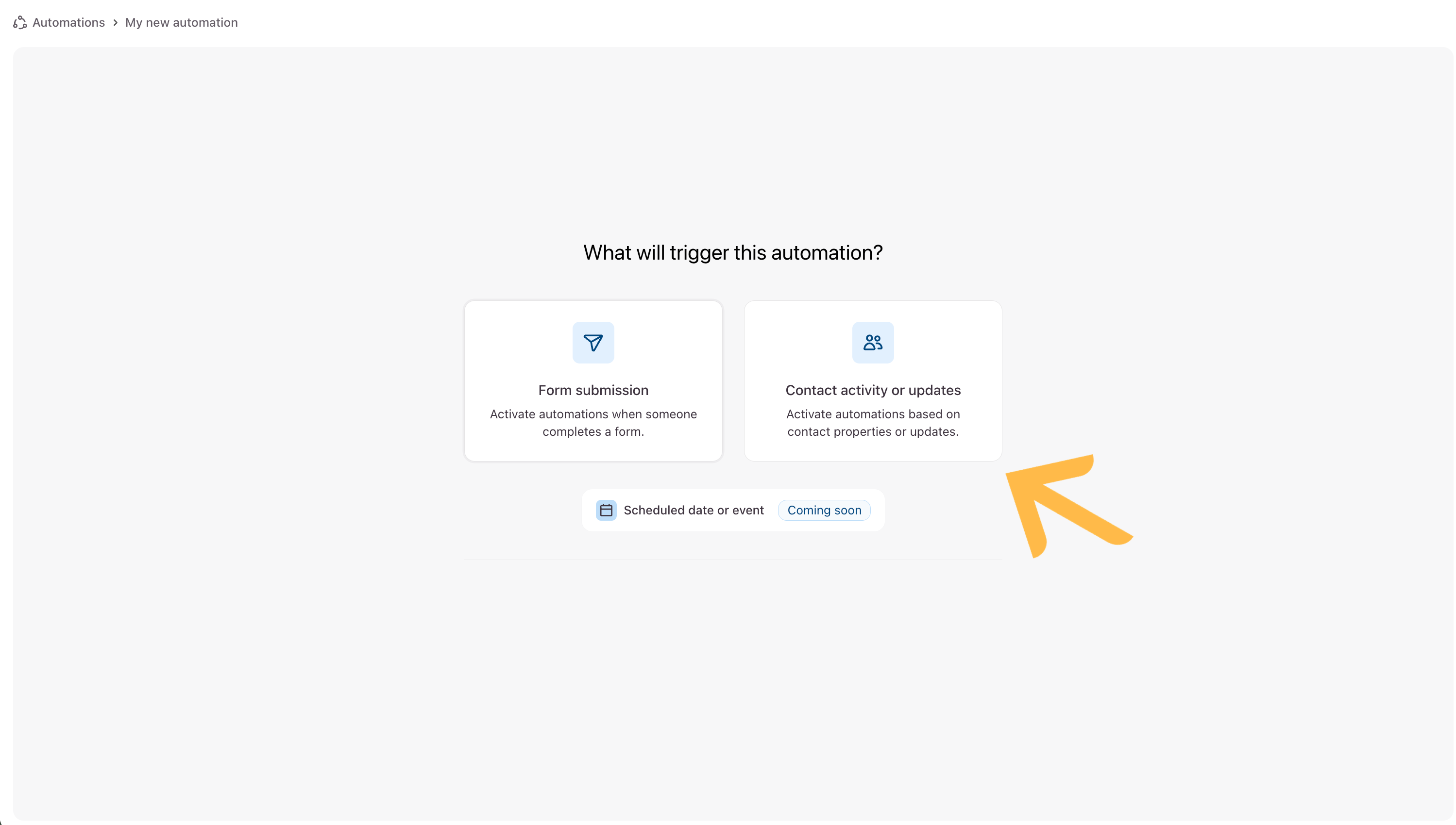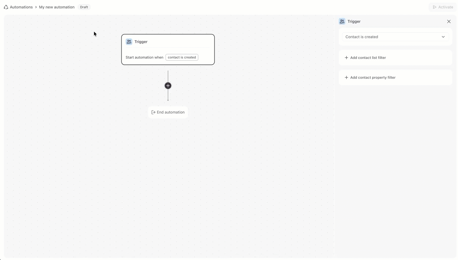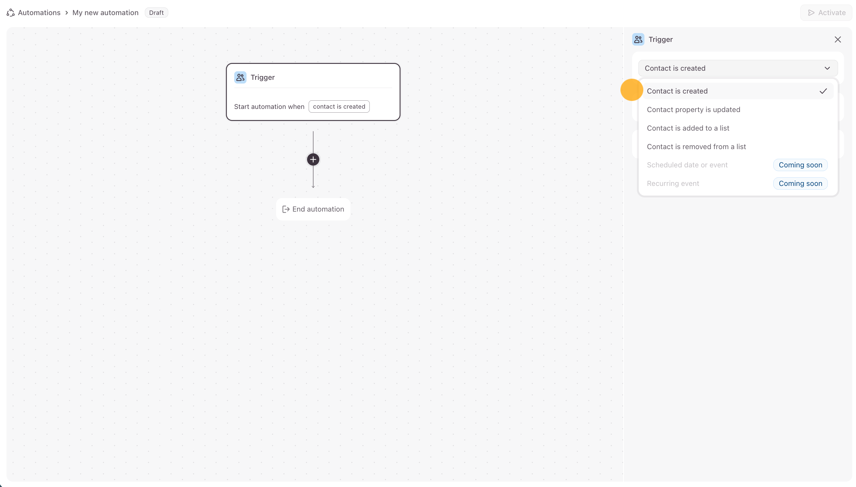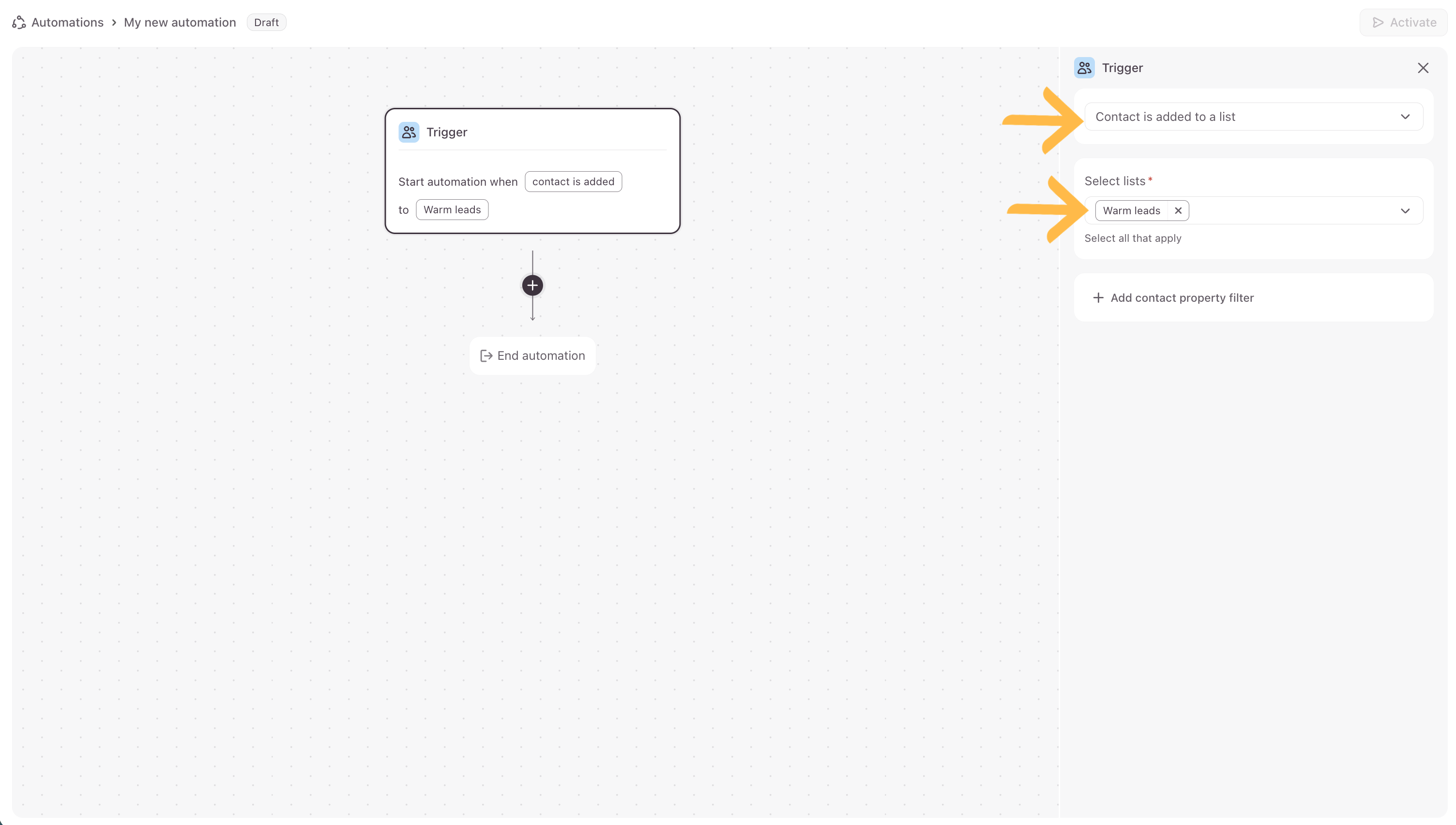 - In the trigger dropdown, select Contact is added to a list, then choose your Warm leads list (for example, contacts whose mapped Job role property is CEO/Founder).