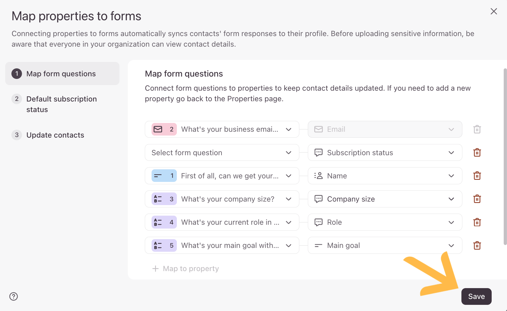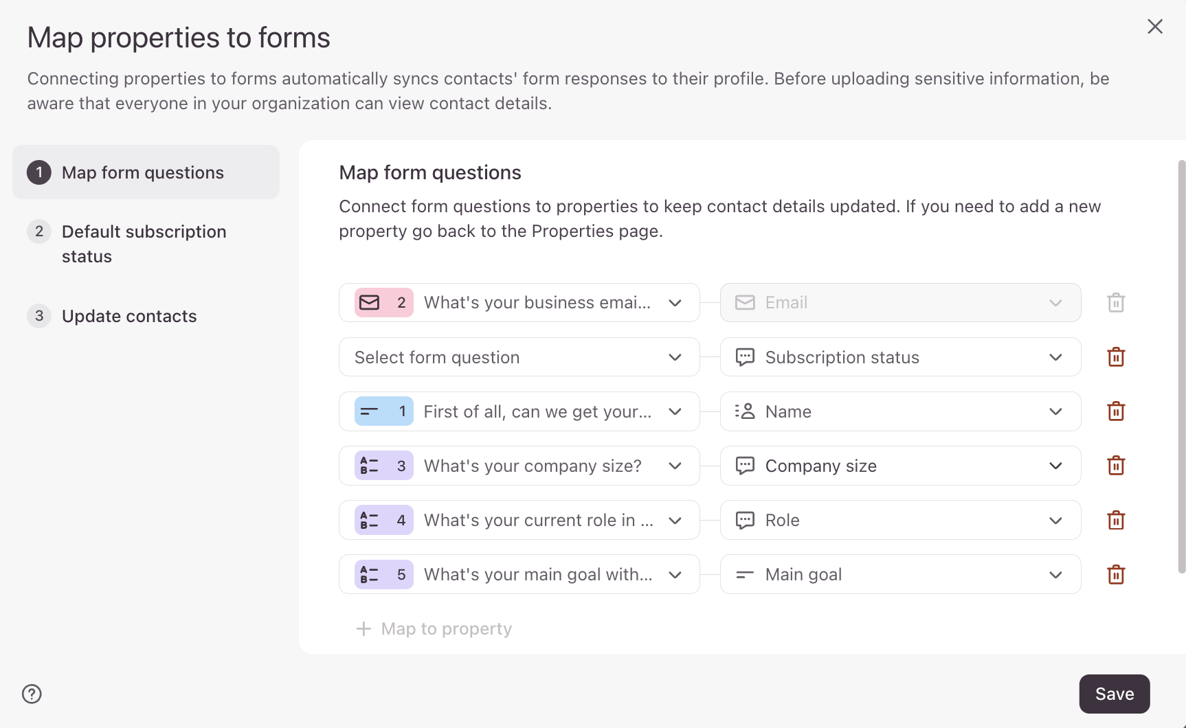 - Follow the steps in Map form responses to contact properties to map your core questions. If you also want to capture details like company size, budget, role, or primary goal and those properties don’t already exist in your Contacts database, first create them as custom contact properties. Learn how in Create and manage your contact properties. Your mappings will look something like this: