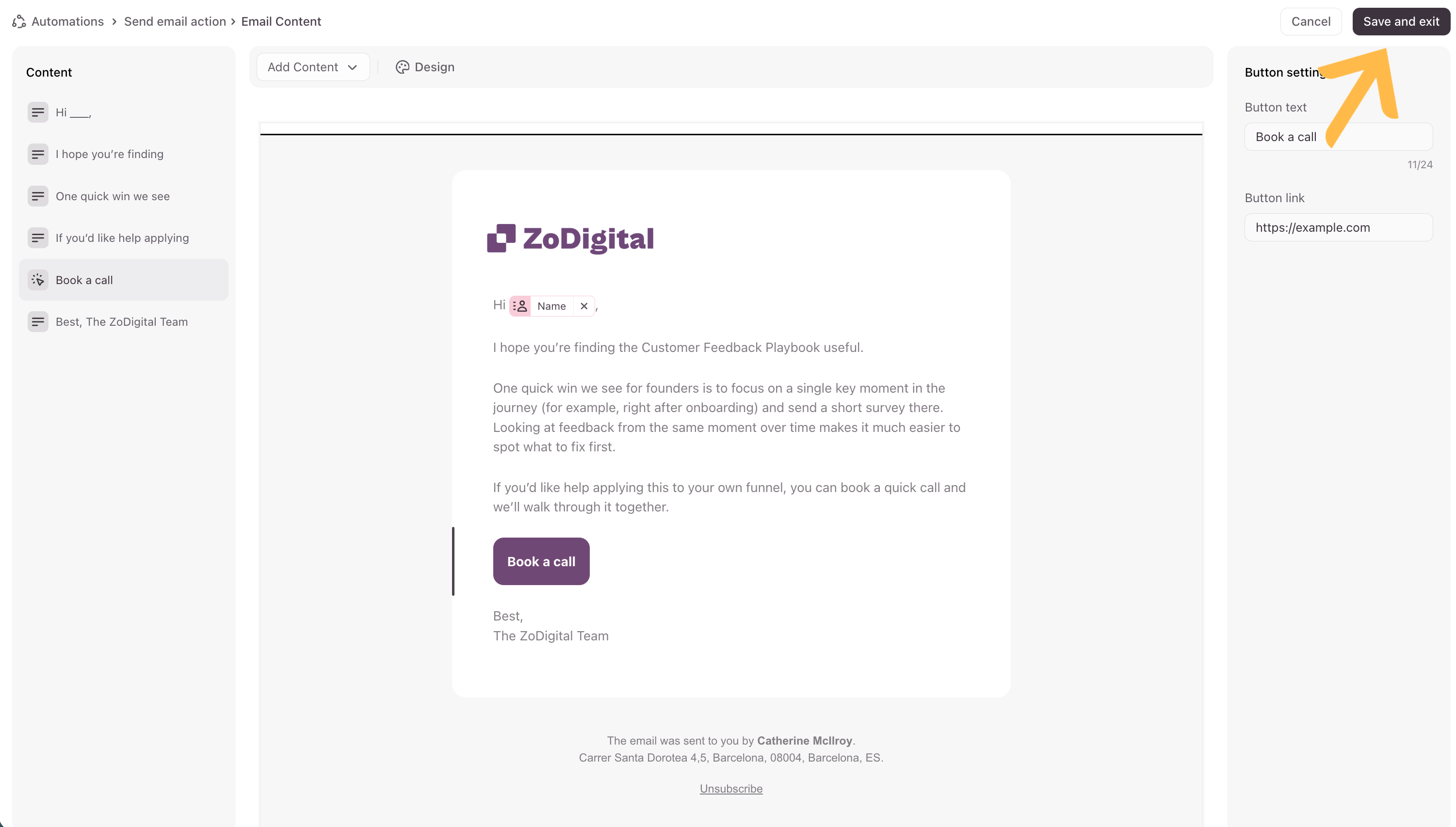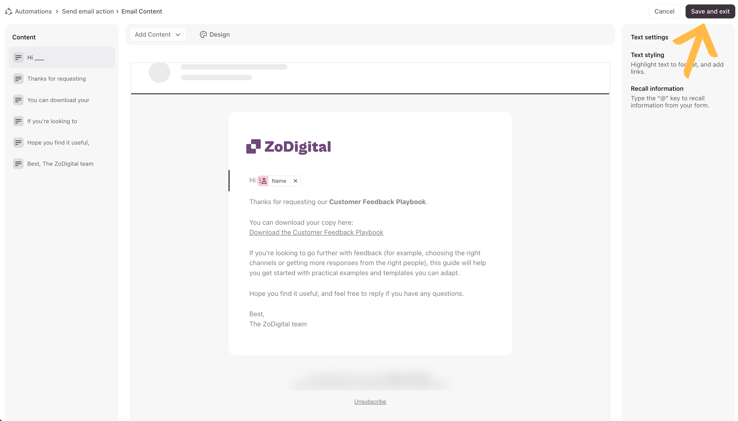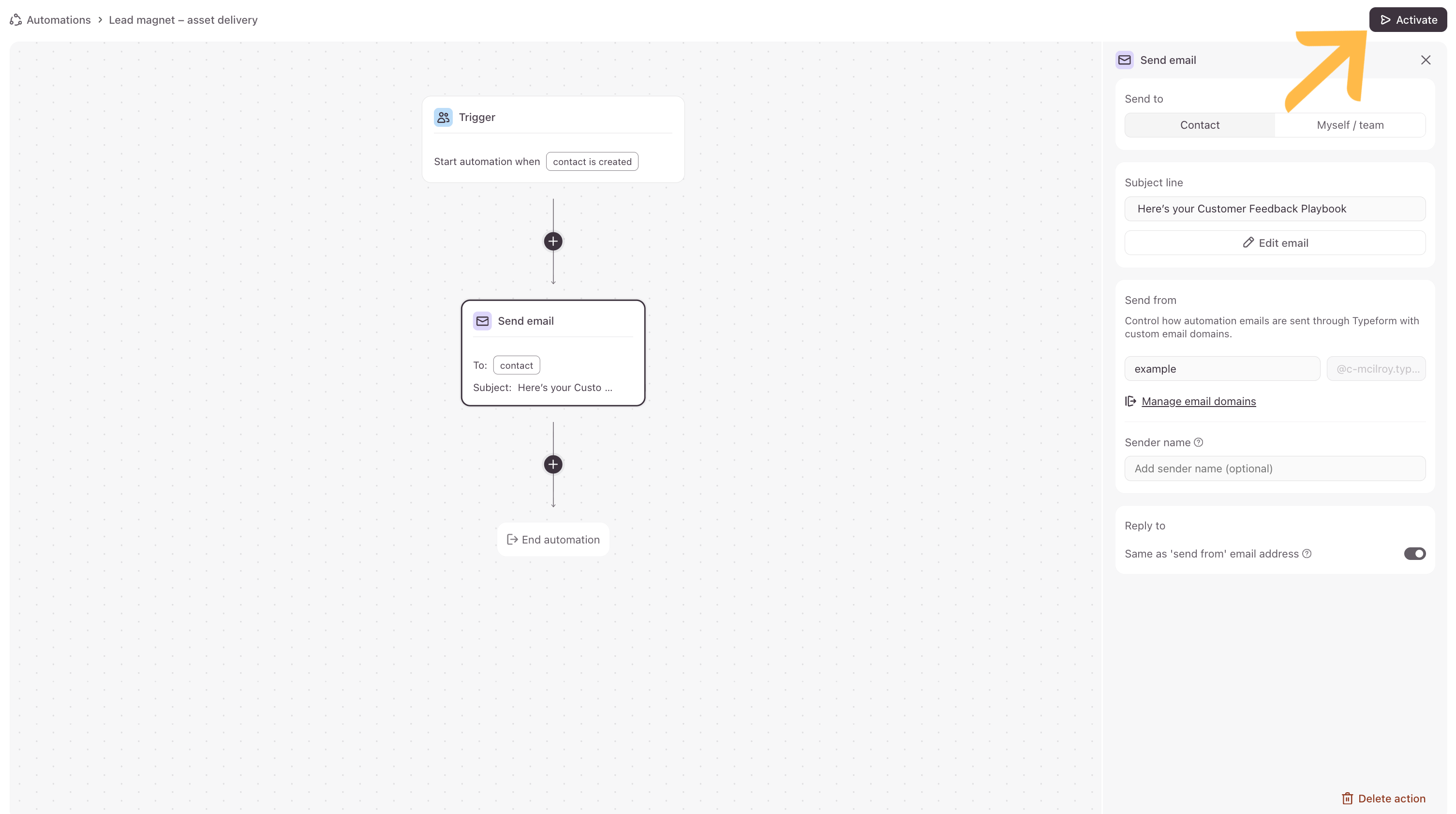- Add a subject line, for example: Here’s your Customer Feedback Playbook