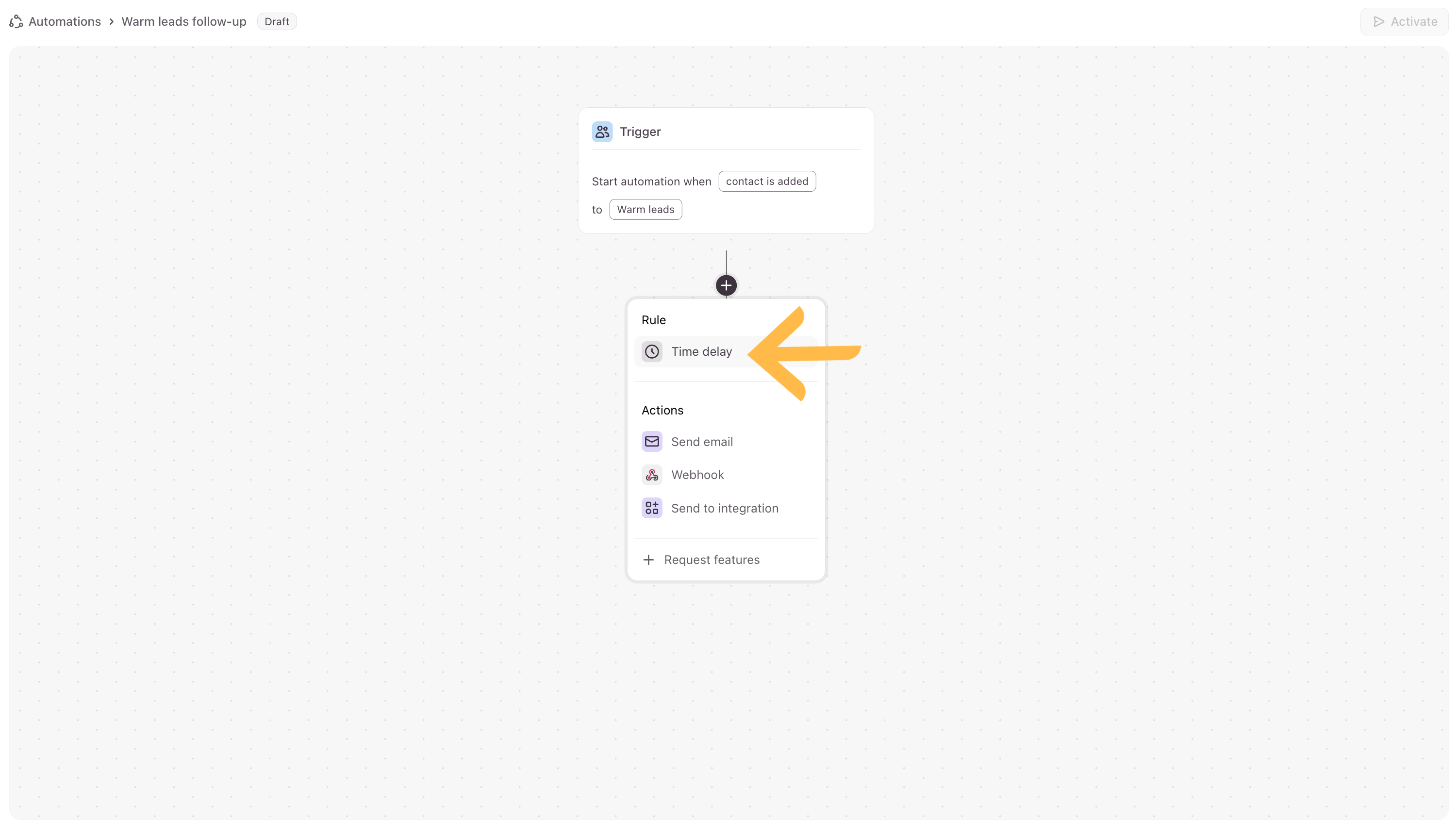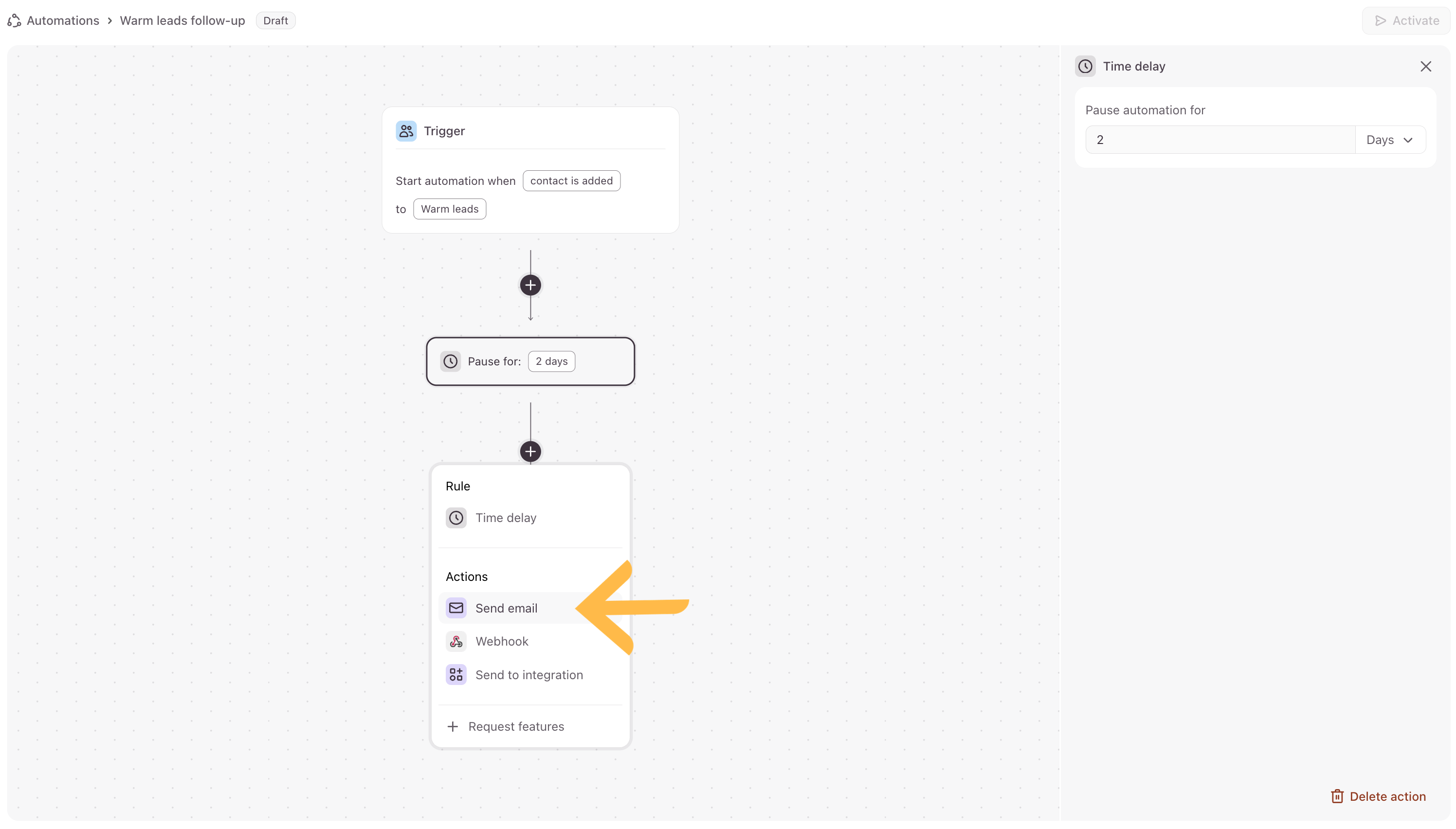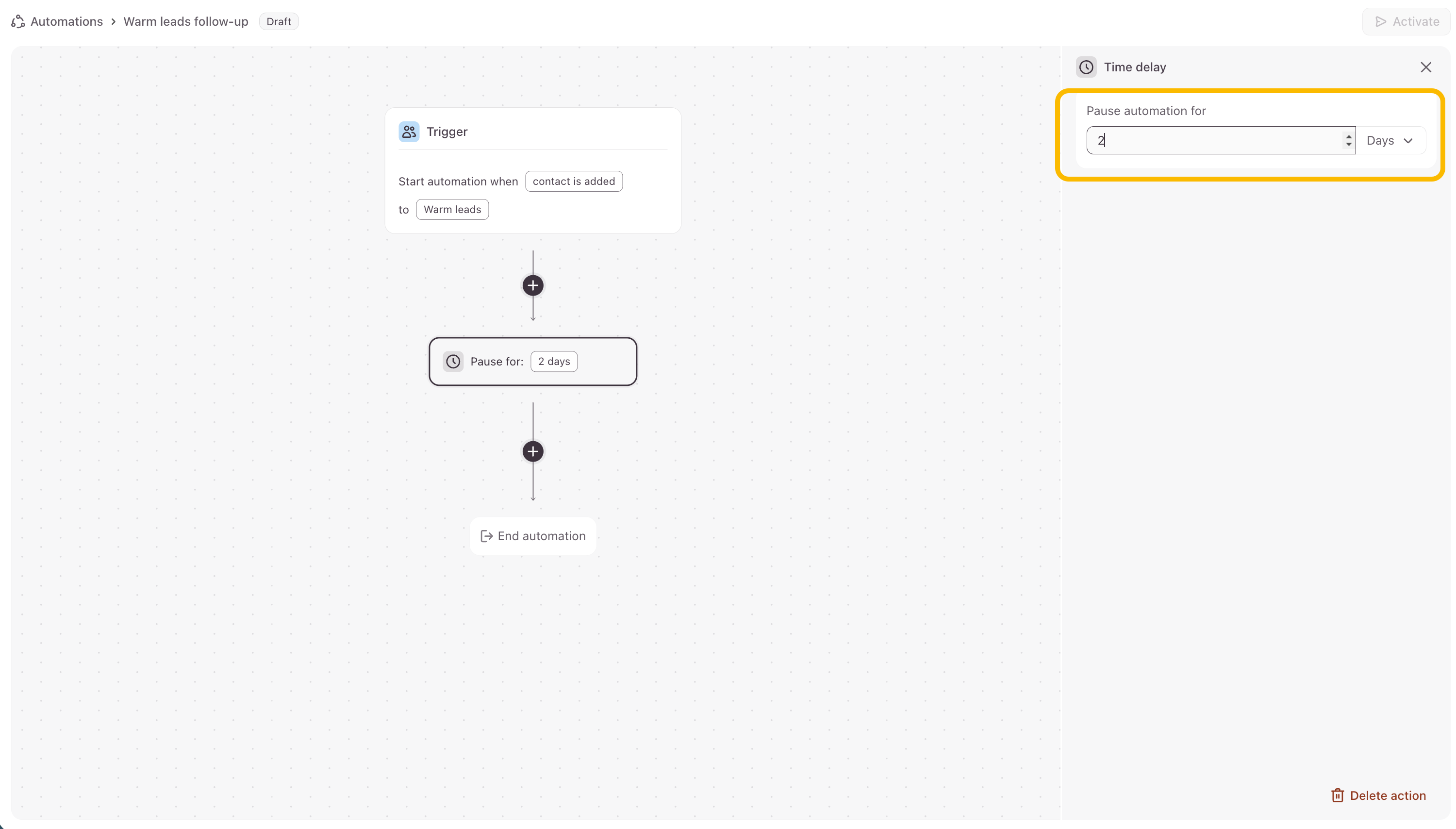 - Set a delay, for example: 2 days after the contact is added to the Warm leads list.