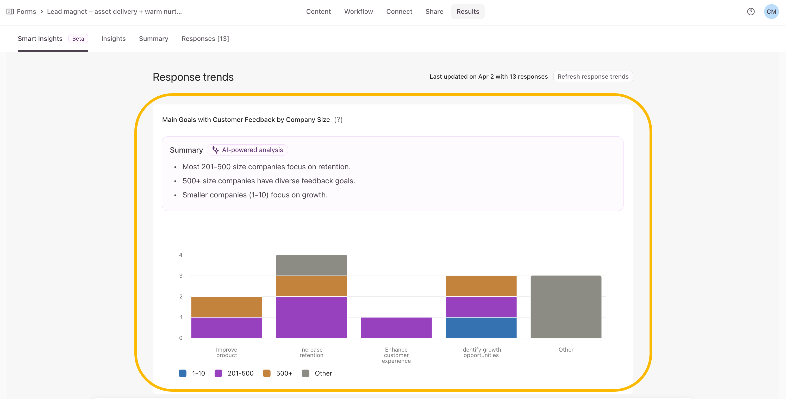 Use Smart Insights to spot patterns in your results. You can review AI-generated summaries and charts for closed-ended questions, and use qualitative analysis to identify themes, sentiments, and response highlights in open-ended answers.