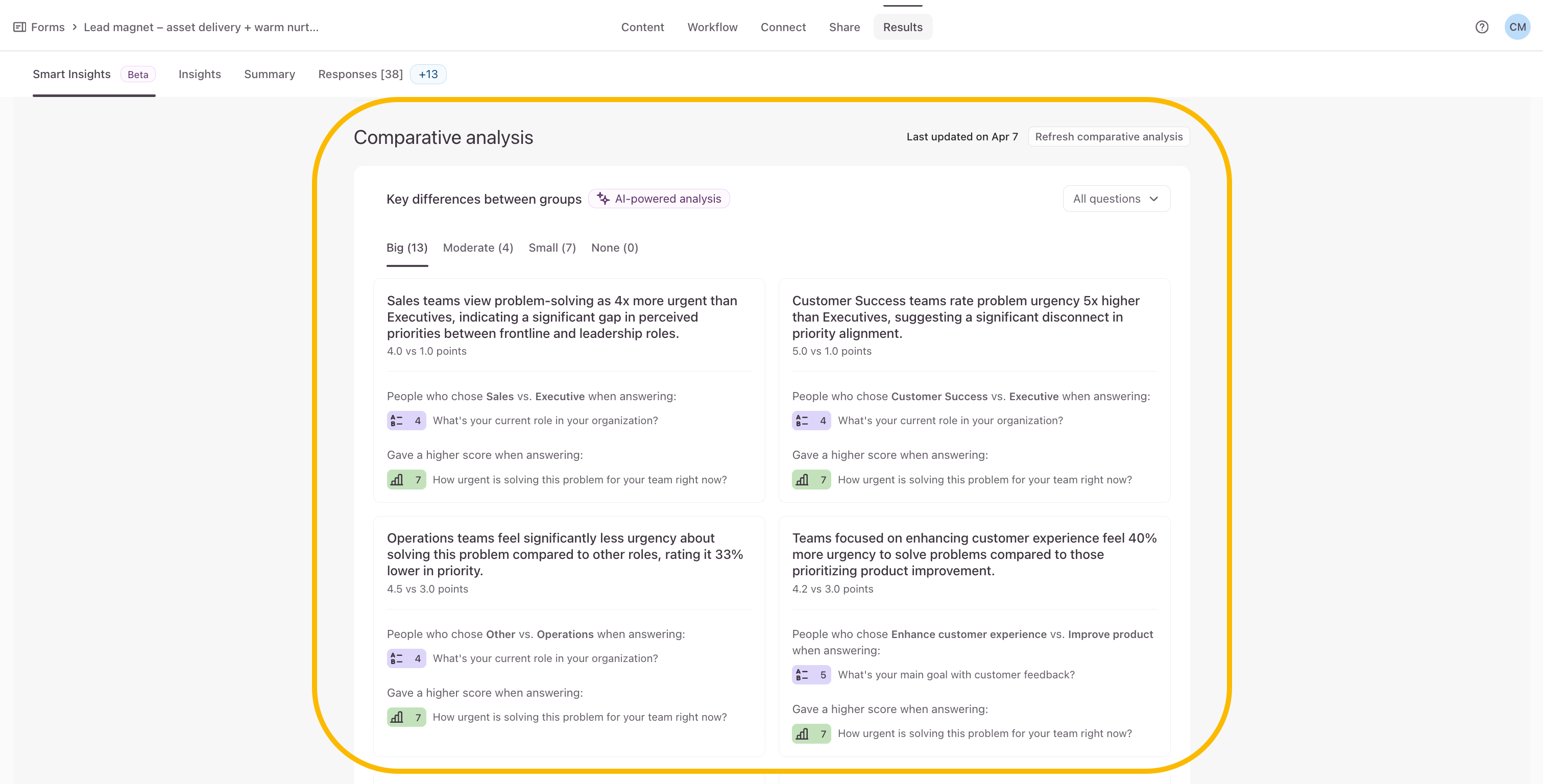 - Comparative analysis to explore how different groups behave (available only if your form has at least one multiple-choice question, one numeric question—NPS, Opinion Scale, Rating, or Number—and 10+ responses)
