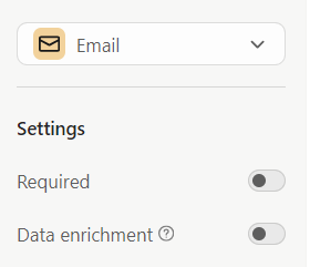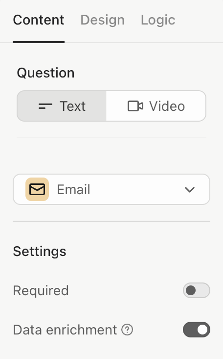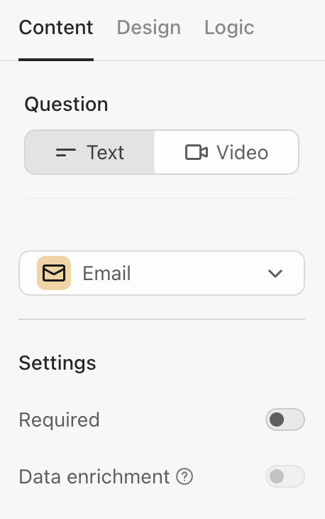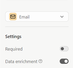 2. Otra opción es que añadas una pregunta de tipo "email" en tu formulario y que la configures como se muestra a continuación. La función de enriquecimiento de datos ("Data enrichment") aparecerá desactivada por defecto.