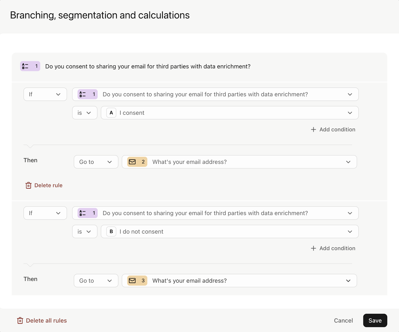 5. Ahora, vamos a utilizar la opción "Ramas, segmentos y cálculos" para enviar a los usuarios a la pregunta de tipo "email" con el enriquecimiento de datos activado en caso de que respondan "Sí, accedo" o bien a la otra, en caso de que no lo hagan. Para ello, pulsa en la pestaña "Lógica" y, después, selecciona la opción "Ramas, segmentos y cálculos". Configura las reglas tal y como te indicamos a continuación: