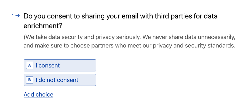 1. Añade una pregunta de tipo "elección múltiple" a tu formulario en la que les pidas permiso a los usuarios para enriquecer sus datos con información adicional:
