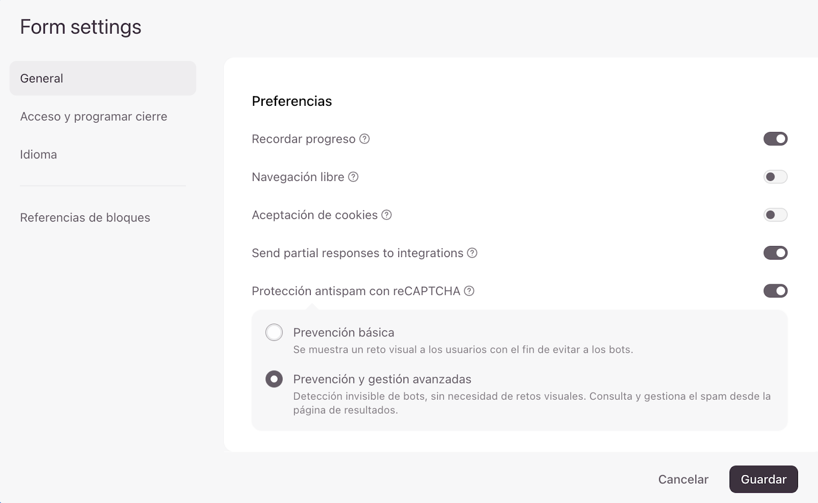 5. Al activar la opción «Prevención y gestión avanzadas», los usuarios no verán un reto visual cuando completen tu formulario. Aun así, las respuestas no deseadas que recibas en tu formulario (en caso de que haya alguna) se mostrarán en una carpeta separada (denominada «Spam») en el panel «Resultados».
