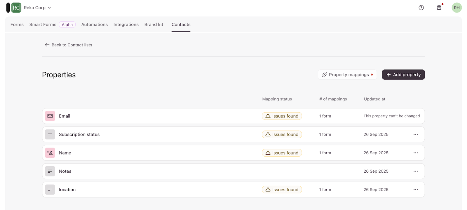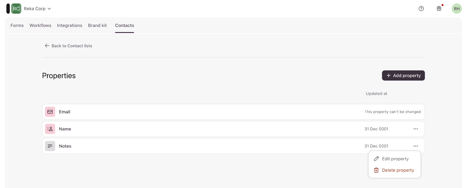 - A continuación, verás las propiedades que se añaden siempre por defecto a tus contactos. Haz clic en el icono de los tres puntos que encontrarás al lado del nombre de una propiedad para editarla o bien eliminarla.