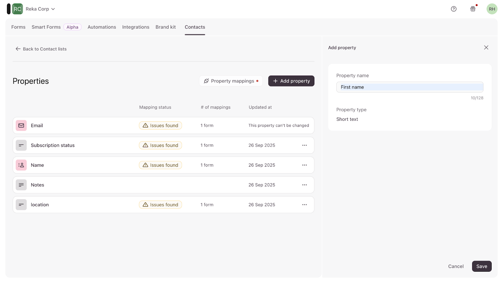 - Ahora, para añadir una propiedad de contacto nueva, haz clic en «+ Añadir propiedad».