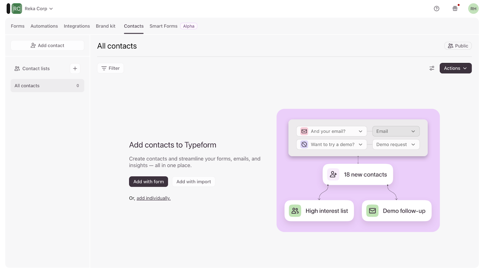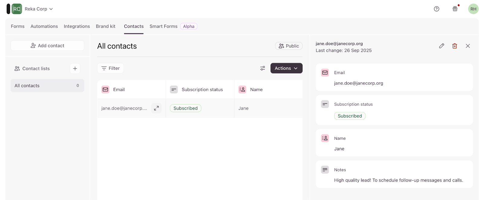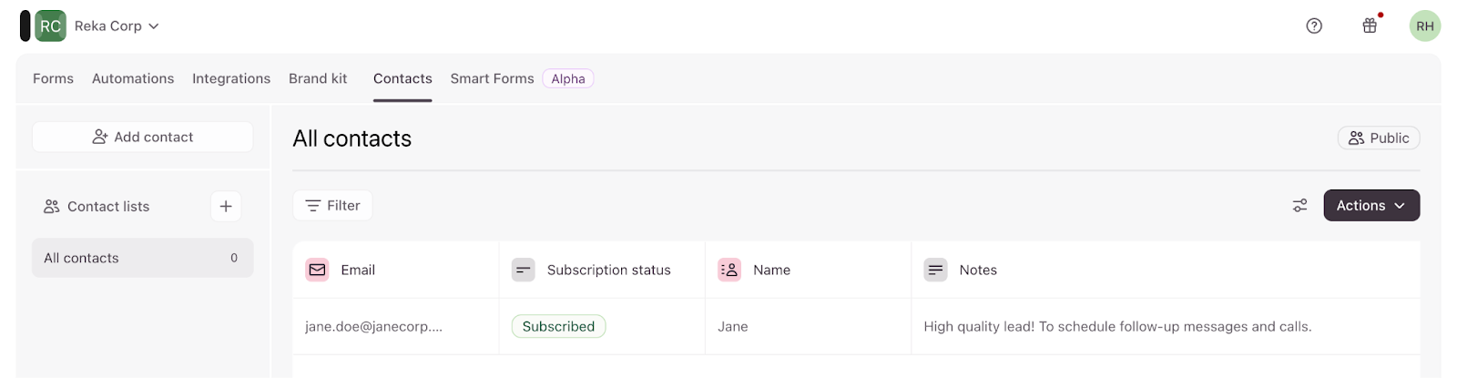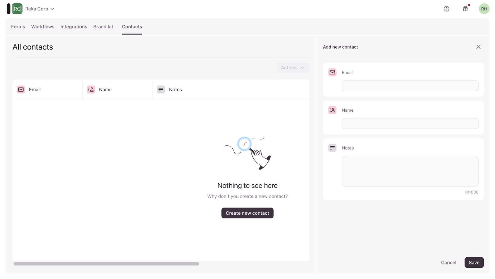 Puedes crear contactos nuevos, así como actualizar los que ya tengas, desde la pestaña «Contactos» de tu cuenta. Para añadir nuevos contactos, puedes utilizar las respuestas facilitadas por los usuarios en tus formularios, importarlos mediante un archivo externo en formato CSV o bien añadirlos uno por uno manualmente.