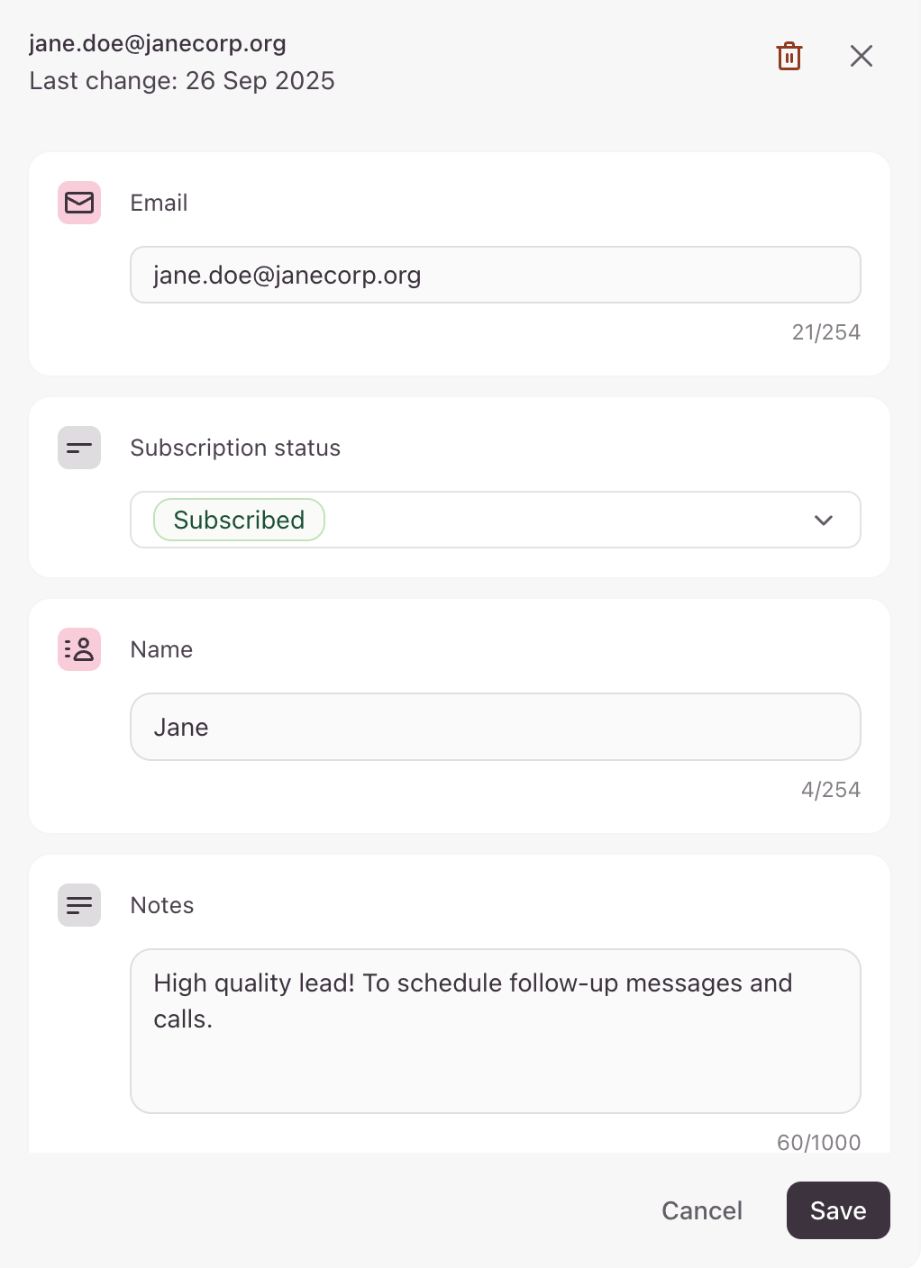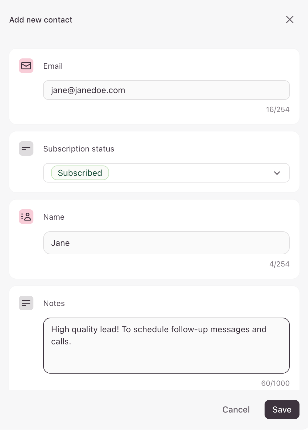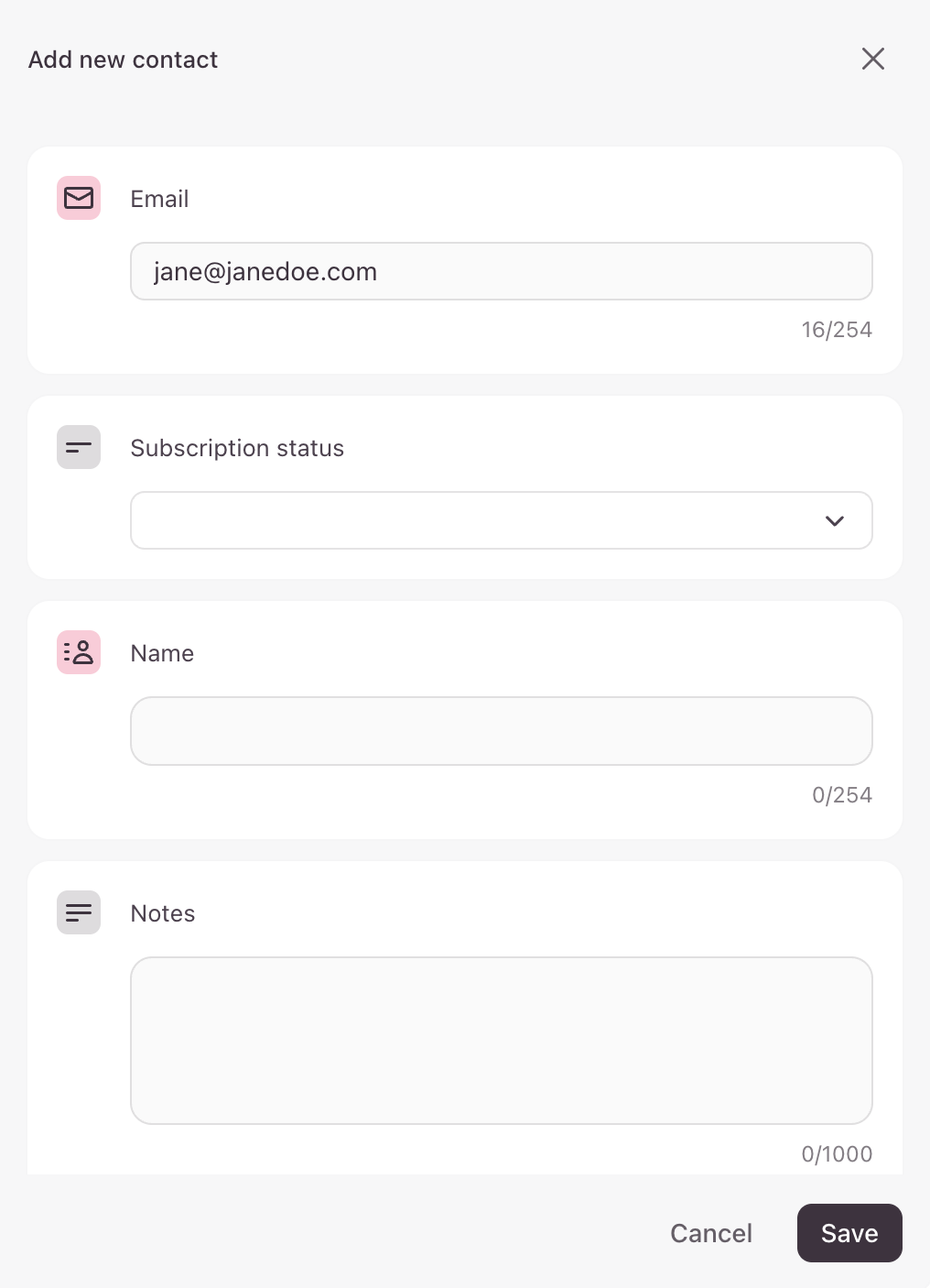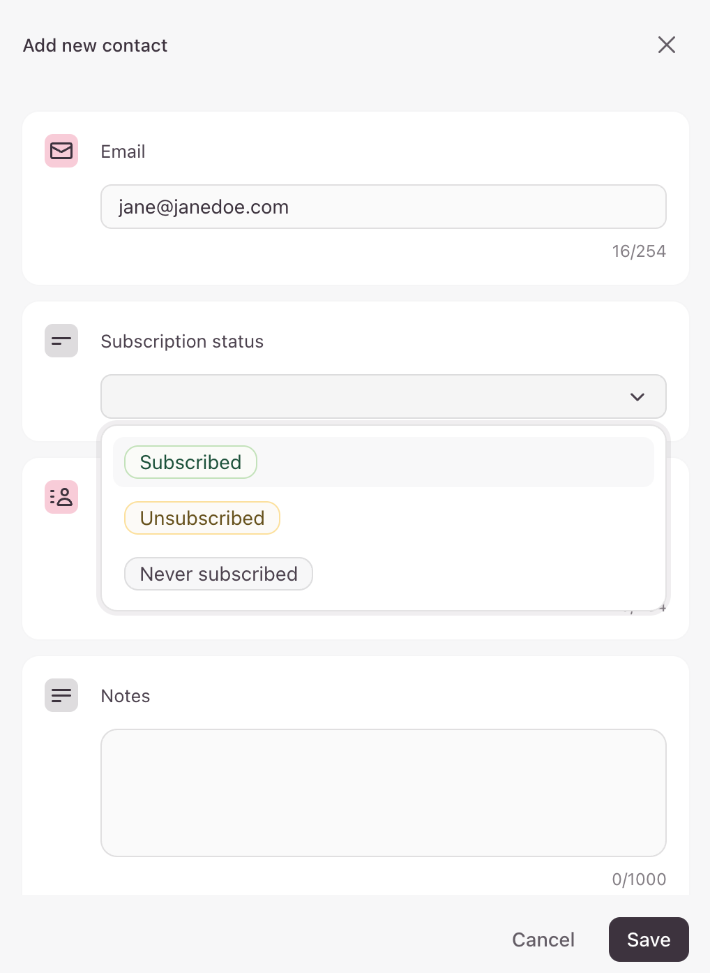 - Ahora, verás las propiedades de contacto predeterminadas: correo electrónico, nombre y estado de la suscripción. Puedes introducir manualmente la información de contacto que necesites en estos apartados. Y también puedes añadir notas sobre el contacto hasta un máximo de 1.000 caracteres.