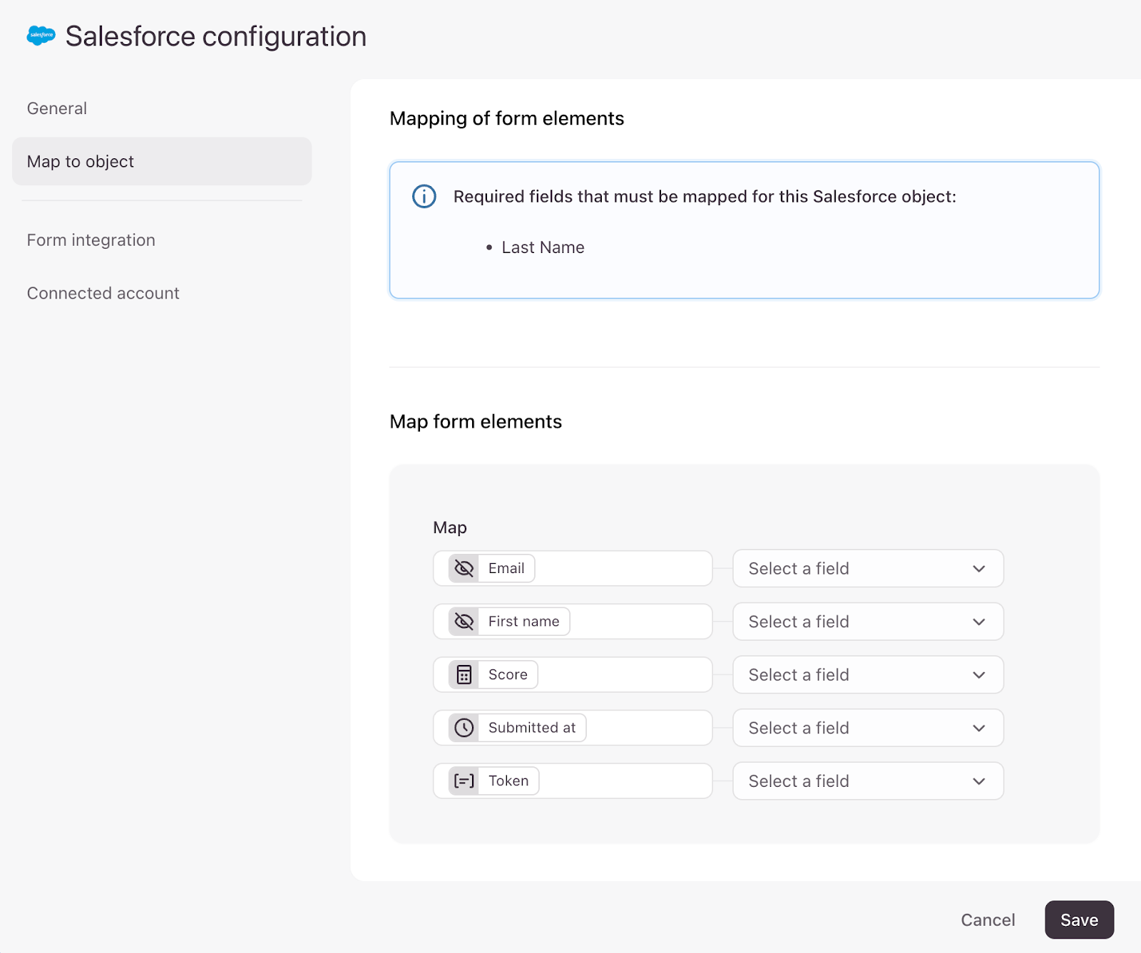 Con esta integración, puedes asociar tus formularios tanto a objetos estándar como a objetos personalizados que hayas creado en Salesforce. Sin embargo, no es posible establecer asociaciones con objetos híbridos, como, por ejemplo, objetos de tarea y persona.