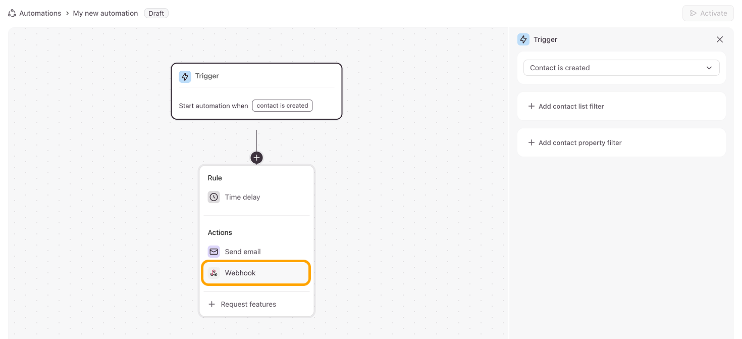 - Una vez hecho esto, verás que el envío de un webhook aparece ahora como acción en las automatizaciones de tus contactos. Haz clic en el botón «Activar» para poner en marcha la automatización.