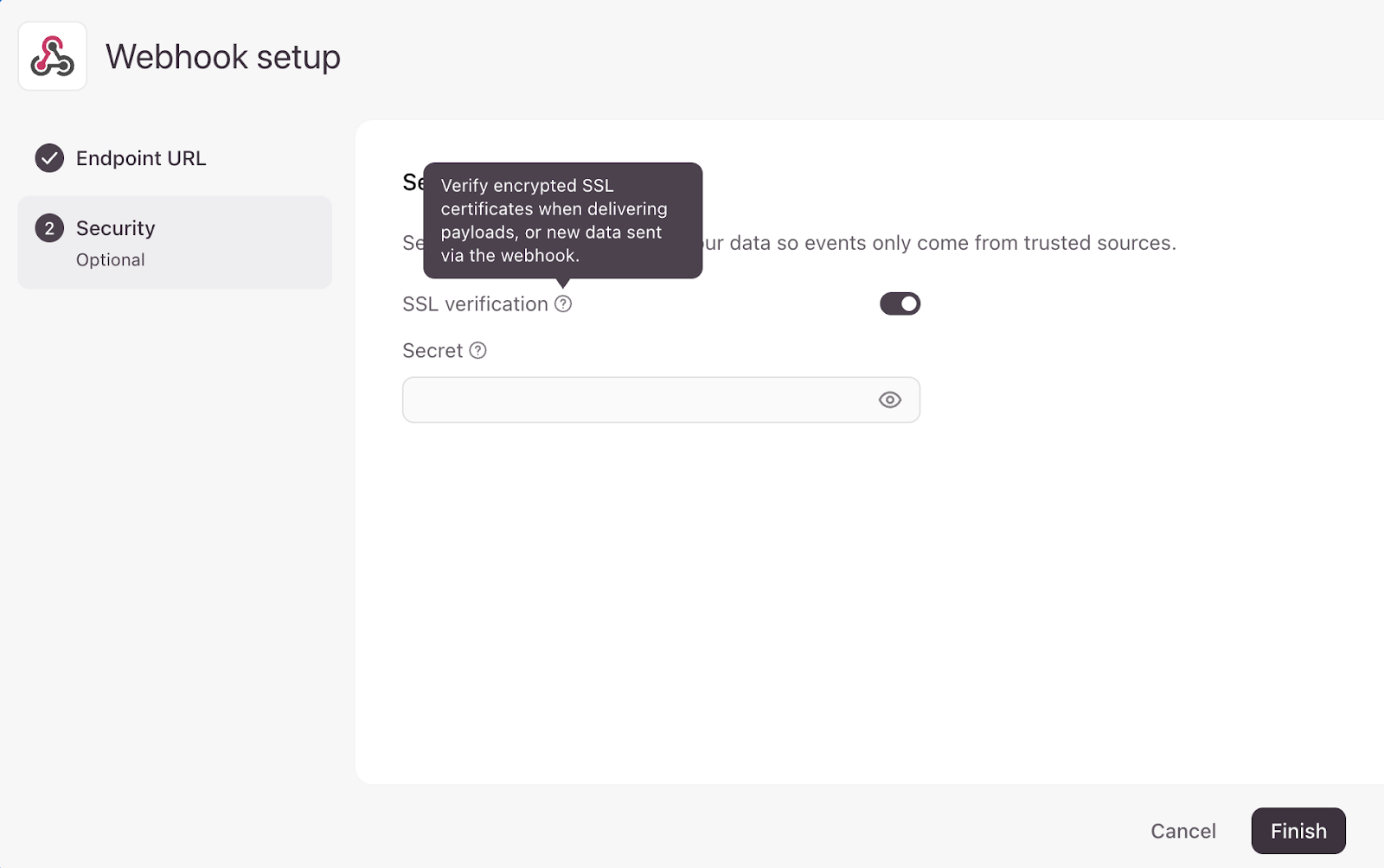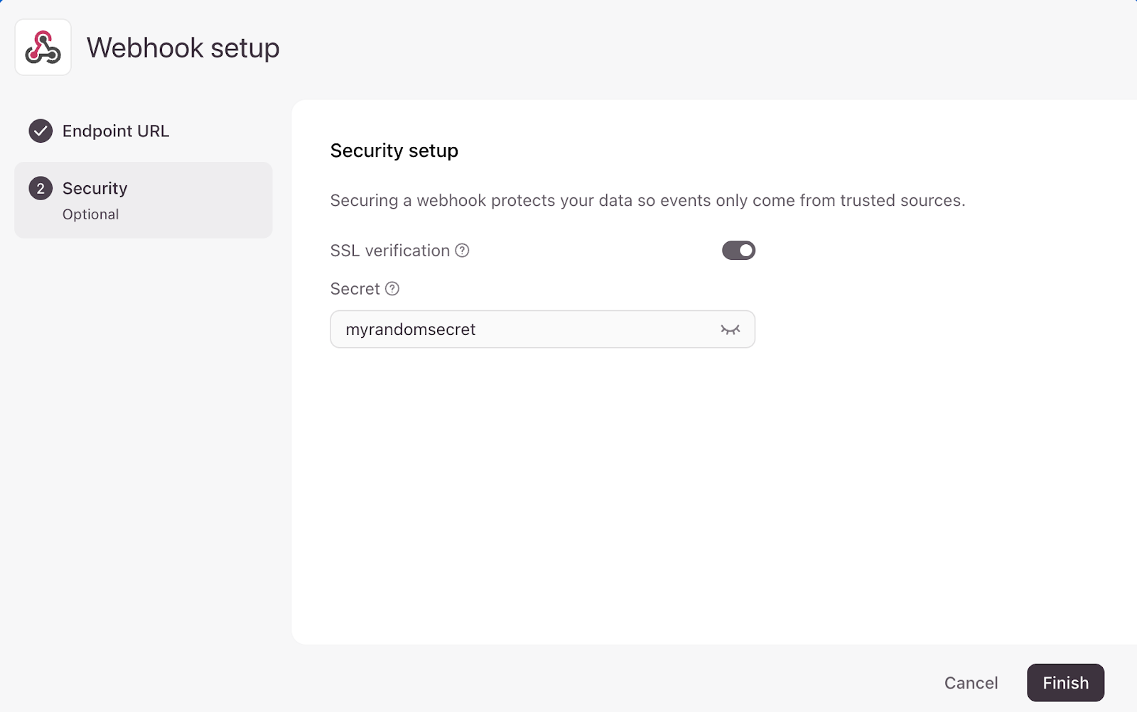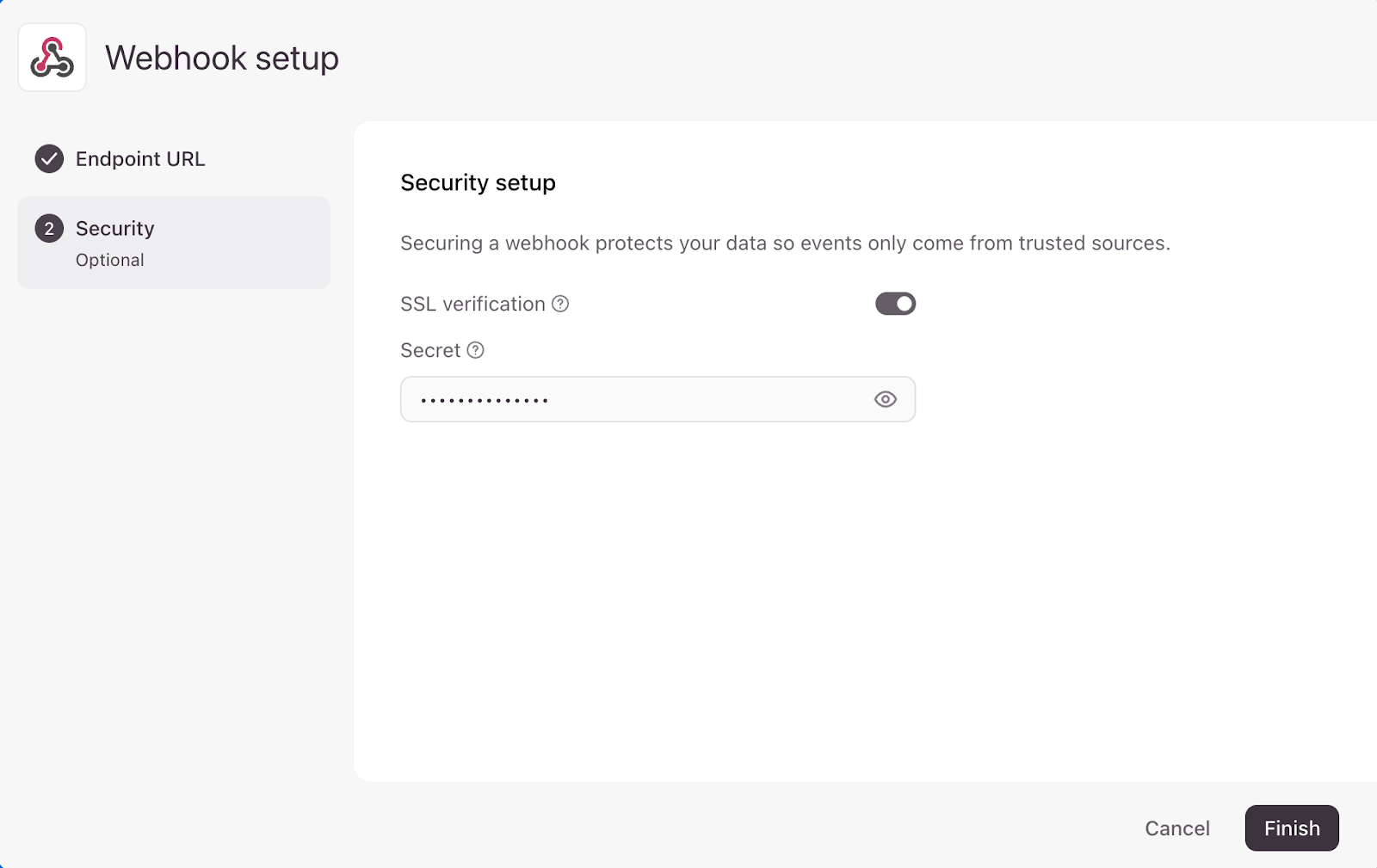 - Puedes hacer clic en el icono en forma de ojo abierto o cerrado para mostrar u ocultar el código secreto que has introducido. Cuando termines de configurar tu webhook, haz clic en el botón «Finish (Terminar)».