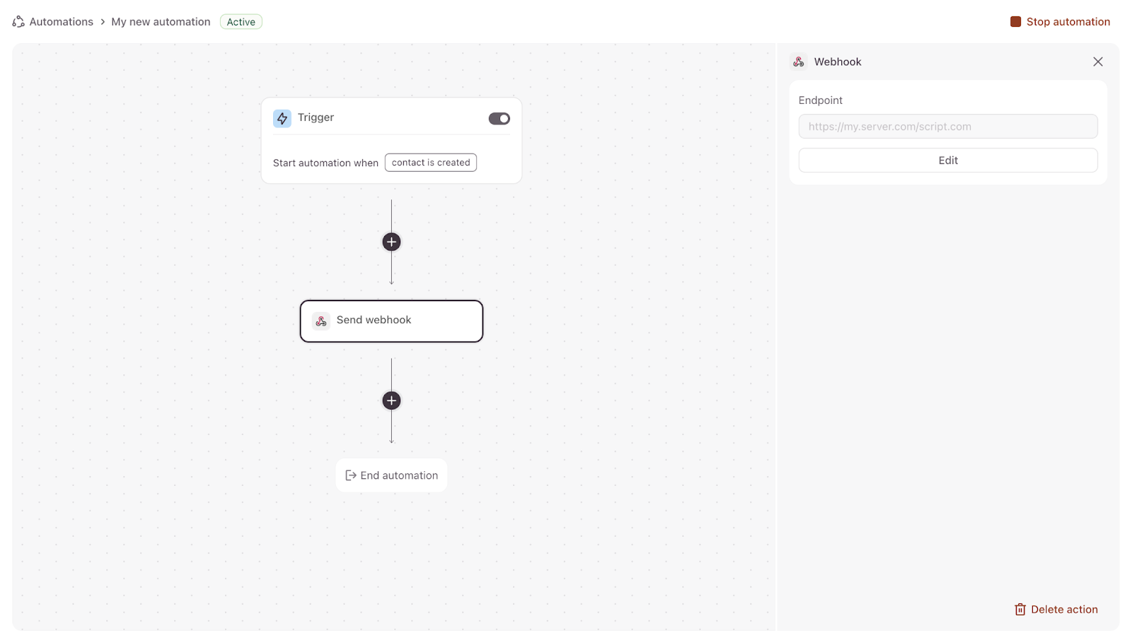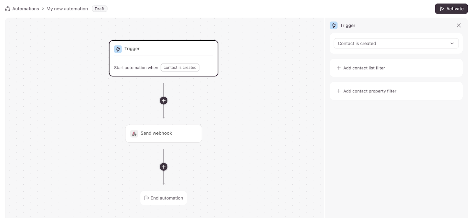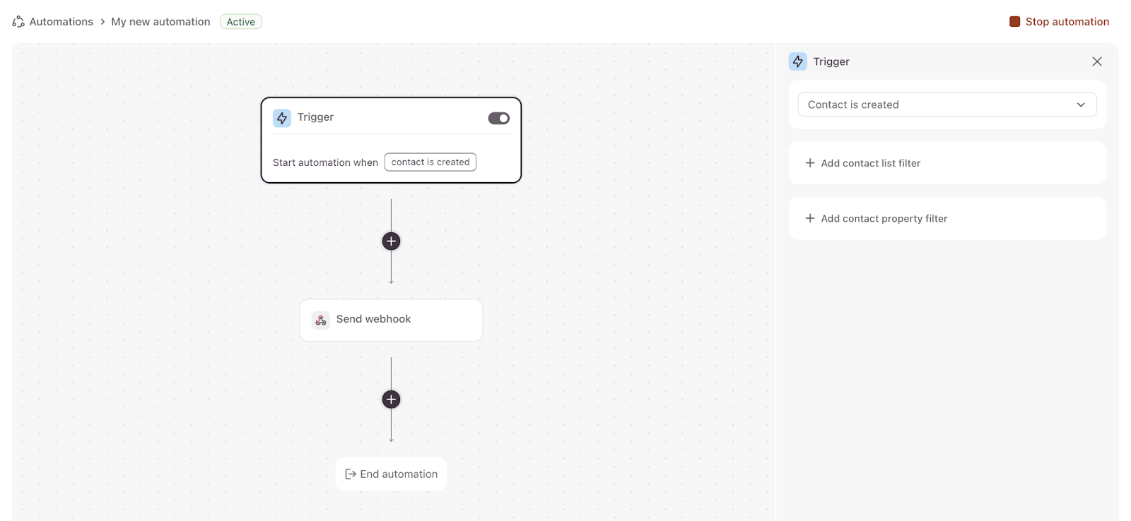 Una vez hayas puesto a prueba tu webhook, tu nueva automatización de contactos estará lista para entrar en acción.