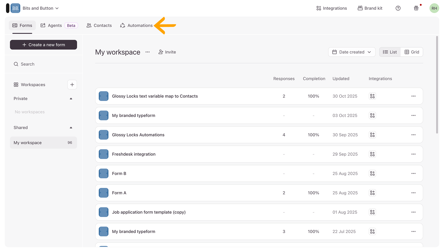 - Accede a tu cuenta de Typeform y haz clic en la pestaña «Automatizaciones».