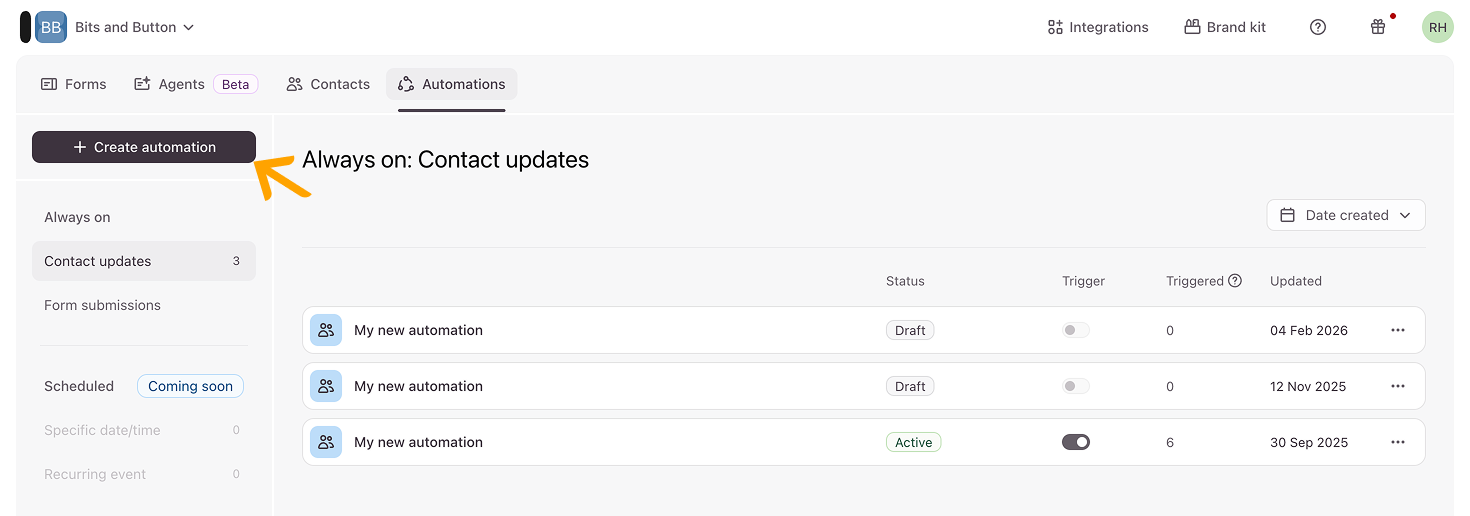 - Haz clic en el botón «+ Crear automatización» para configurar una nueva automatización o bien abre una que ya tengas creada.